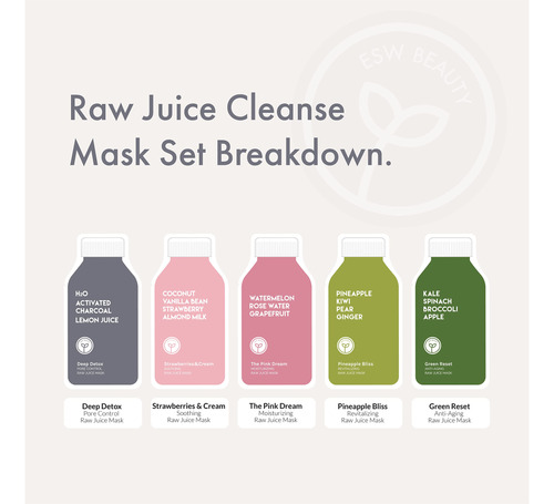 Este pacote de 5 contém uma mistura de máscaras hidratantes, calmantes, antienvelhecimento e clarificadoras alimentadas por superalimentos como melancia, couve, espirulina azul e carvão ativado.