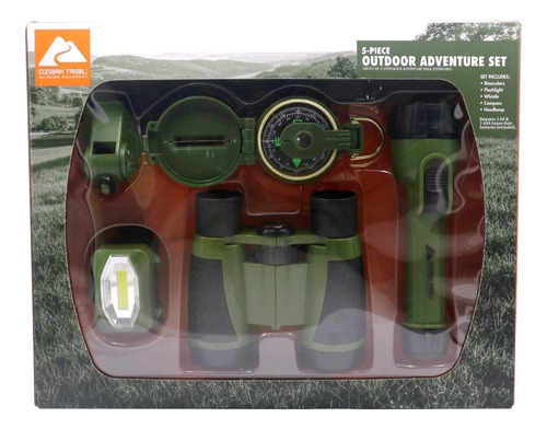 Ozark Trail 5-piece Outdoor Adventure Set includes binoculars, flashlight, whistle, compass, and head lamp. The set requires 2 AA and 3 AAA heavy-duty batteries, which are included. – Five-piece Outdoor Adventure Set – Set Includes Binoculars, Flashlight, Whistle, Compass, Headlamp – Requires 2 AA amd 3 AAA heavy-duty batteries (included)