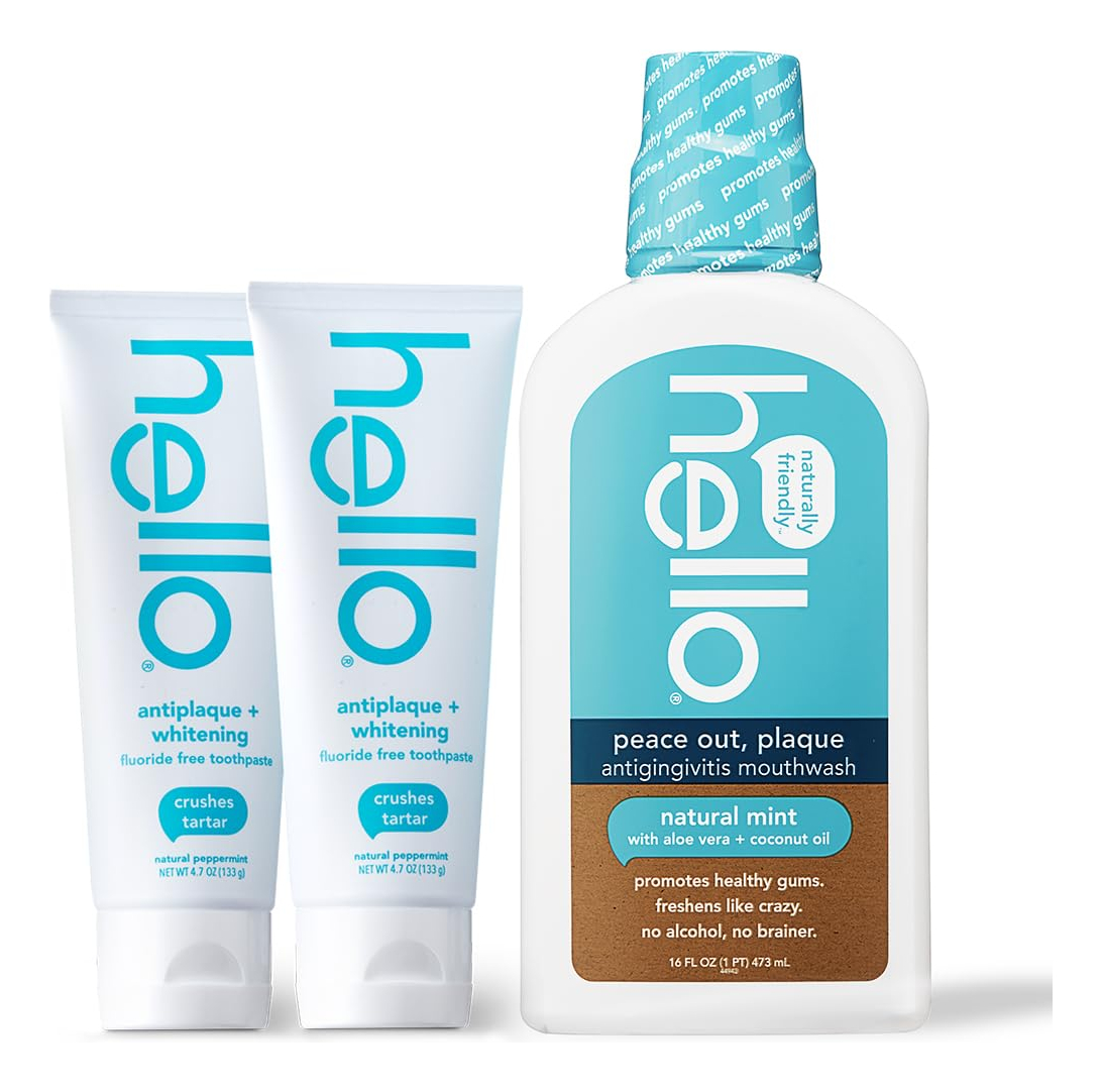 Creme dental antiplaca e branqueador Hello, sem flúor e enxaguante bucal antigengivite naturalmente saudável, sem álcool, vegano, sem SLS e sem glúten, tubos de 4,7 onças, frasco de 16 onças — Contém dois tubos de 4,7 onças de creme dental antiplaca e clareador Hello, sem flúor e um frasco de 16 onças de enxaguante bucal Hello, naturalmente saudável — Formulado cuidadosamente sem manchas açafrão branco, óleo de coco, hortelã cultivada na fazenda e xilitol para clarear os dentes naturalmente – Diga olá a uma pasta de dente branca com açafrão e óleo de coco que ajuda a remover a placa bacteriana enquanto escovar e refrescar o hálito com hortelã natural cultivada na fazenda no Vale do Willamette, no Oregon – O creme dental Hello Brightening Booster sem flúor não contém corantes, sem SLS, sem adoçantes e sabores artificiais, sem parabenos, sem peróxido e sem glúten. Óbvio: escolha de forma amigável. Hello é vegano, nunca foi testado em animais (certificado Leaping Bunny) e é feito nos EUA. Escove e cumprimente livremente