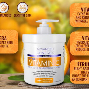 Melhore suas feições, viva com beleza Usar um creme de vitamina C em sua rotina de cuidados com a pele é uma excelente opção para experimentar a visão de uma pele com aparência mais jovem. Nosso creme facial e corporal com vitamina C fornece uma barreira protetora de umidade enquanto sacia a pele sedenta, para que você possa dizer adeus às linhas finas e rugas visíveis. Ilumina a pele, aliviando visivelmente o escurecimento e os danos causados pelo sol. Está clinicamente comprovado que aumenta a luminosidade da pele Reduz visivelmente os sinais de envelhecimento, proporcionando um brilho mais suave, brilhante e natural. Ingredientes puros, benefícios premium A natureza fornece os ingredientes, enquanto a ciência aprimora e confirma a potência de cada fórmula cosmecêutica produzida pela Advanced Clinicals, oferecendo os produtos de beleza mais eficazes, seguros e limpos disponíveis. Graças aos nossos vegetais naturais, vitaminas puras, fórmulas patenteadas potentes e produtos de primeira qualidade, sua pele se beneficia sem sofrer os golpes e irritações que acompanham muitos produtos cosméticos. As fontes botânicas em nossas fórmulas são cuidadosamente selecionadas de fornecedores de alto valor. Em seguida, eles são combinados em nossas instalações de produção nos EUA, atendendo aos padrões inabaláveis de qualidade e segurança. Mergulhe sua pele, seja qual for o tipo, com resultados puros com seu creme hidratante de vitamina C para rosto e corpo! Esta loção hidratante de vitamina C da Advanced Clinicals oferece uma tez saudável e radiante, melhorando a textura e o tom da pele. Nossos ingredientes fornecem hidratação adicional à pele e benefícios calmantes. – VITAMINA C A incorporação de uma loção corporal com infusão de vitamina C em sua rotina diária de cuidados com a pele pode ajudar a promover uma tez mais saudável, radiante e com aparência jovem. A vitamina C ajuda a promover um tom de pele uniforme, ao mesmo tempo que ajuda a estimular a produção de coleções para melhorar a elasticidade e firmeza da pele. A vitamina C também ajuda a minimizar a vermelhidão ou irritação na pele, ajuda a proteger contra estressores ambientais, como os raios UV, e ajuda a reduzir a aparência de linhas finas, danos causados pelo sol e rugas. – PELE RADIANTE Este creme corporal de vitamina C da Advanced Clinicals ajuda a refinar a aparência da pele envelhecida e o tom irregular da pele. A vitamina C ajuda a promover um tom de pele uniforme, ao mesmo tempo que ajuda a estimular a produção de coleções para ajudar a melhorar a elasticidade e firmeza da pele. O creme corporal e a loção facial iluminadora avançada de vitamina C ajudam a refinar a aparência da pele descolorida, manchas da idade, sardas, danos causados pelo sol, textura áspera da pele, hiperpigmentação e cicatrizes de acne. – INGREDIENTES EFICAZES A loção corporal de vitamina C da Advanced Clinicals é formulada com a combinação perfeita de ingredientes eficazes antienvelhecimento e clareadores, incluindo óleo de coco, aloe vera, ácido ferúlico, vitamina E, glicerina, e mais. O óleo de coco hidrata profundamente a pele, melhora a elasticidade e fornece uma barreira protetora para ajudar a evitar a perda de umidade. A vitamina E ajuda a proteger a pele contra os radicais livres e os danos causados pelos raios UV. Aloe Vera ajuda a acalmar e hidratar a pele. – NÃO OLEOSA E DE FÁCIL ABSORÇÃO Esta fórmula não oleosa com infusão de vitamina C é facilmente absorvida pela pele e é rica o suficiente para ser um hidratante corporal de longa duração, mas também suave o suficiente para ser usada como hidratante facial diário. Formulado para ser seguro para todos os tipos de pele, incluindo pele oleosa e pele sensível. Hidrate, ilumine e hidrate a pele opaca e sem brilho com esta loção hidratante facial e corporal de vitamina C da Advanced Clinicals para ajudar a deixar sua pele mais lisa, firme e radiante. – SÉRUM DE VITAMINA C O soro de vitamina C ajuda a refinar a aparência da pele descolorida, manchas da idade, sardas, danos causados por manchas solares, hiperpigmentação, cicatrizes de acne e muito mais. O sérum facial com vitamina C contém ingredientes antienvelhecimento eficazes, incluindo o oligopeptídeo palmitoil, que aumenta a produção de colágeno, melhora a textura da pele, firma a pele ao redor dos olhos e ilumina e hidrata a pele. Também inclui ácido glicólico, que é muito eficaz na redução de linhas de expressão persistentes, acne e oleosidade.