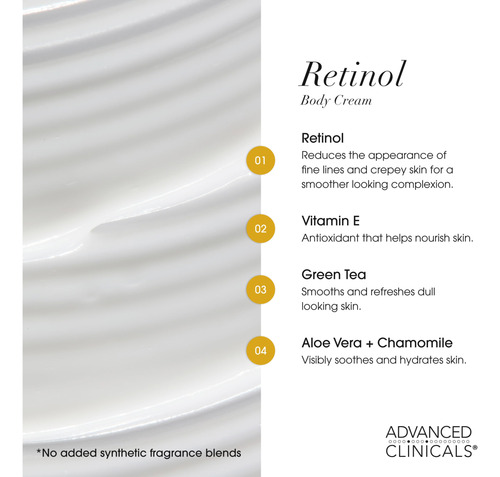 – O CREME DE RETINOL AJUDA A HIDRATAR A PELE, SUAVIZA E FIRMA VISIVELMENTE A APARÊNCIA DA PELE ENVELHECIDA – Este creme corporal de retinol ajuda a hidratar a pele, reduzindo visivelmente a aparência de linhas finas, rugas e pele cremosa, promovendo uma tez mais firme e com aparência mais jovem. Sua textura ultra-rica pode parecer uma manteiga corporal, mas sem um acabamento oleoso. Esta fórmula avançada é adequada para a rotina diária de cuidados com a pele, ajudando a hidratar e melhorar a aparência da textura da pele.