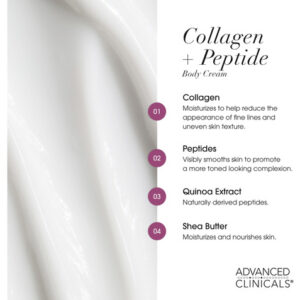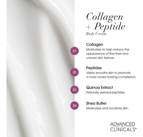 – LOÇÃO CORPORAL COM PEPTÍDEO DE COLÁGENO COM MANTEIGA DE KARITÉ, SEMENTE DE QUINOA, CHÁ VERDE E VITAMINA E – Oferece hidratação à pele, ajudando a reduzir a aparência de pele crepitante, linhas finas e rugas. Essa mistura avançada promove uma pele visivelmente mais firme e com aparência elevada. Delicie-se com uma hidratação suave e uma tez rejuvenescida e saudável. Pode ser usado em todo o corpo, incluindo pescoço, braços, mãos, coxas e pernas. É facilmente absorvido pela pele seca. Use diariamente conforme necessário.