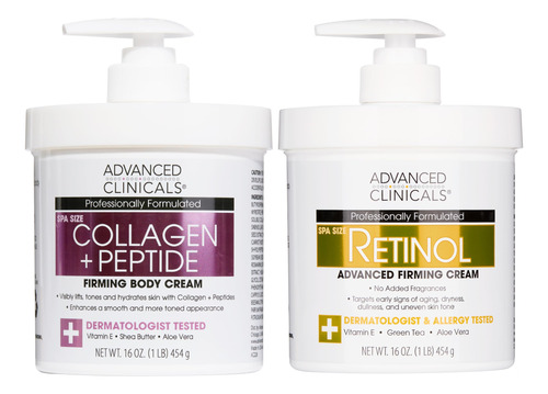 Creme de retinol e peptídeos de colágeno Advanced Clinicals Conjunto de 2 peças para cuidados com a pele Loção corporal para pele seca para mulheres e homens para ajudar a melhorar a aparência da pele cremosa, pacote de 2 peças O CREME DE PEPTÍDEO DE COLÁGENO FORNECE HIDRATAÇÃO PARA UMA PELE MAIS FIRME E REVIGORANTE