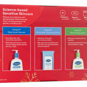 Conjunto de cuidados com a pele Cetaphil Winter Essentials, pano suave para limpeza de pele, lenços faciais 25 unidades, limpador facial diário de 8 onças, loção hidratante facial e corporal de 8 onças, adequada para peles sensíveis — APOIADO POR DERMATOLOGISTAS: uma rotina diária de cuidados com a pele para rosto e corpo com uma mistura de ingredientes apoiada por dermatologistas. Inclui sabonete facial, loção facial e corporal e toalhetes removedores de maquiagem — PANOS SUAVES PARA LIMPEZA DA PELE: remova completamente a maquiagem e a sujeira, deixando a pele limpa, refrescada e equilibrada após cada uso. — LIMPADOR FACIAL DIÁRIO CETAPHIL: limpa profundamente e minimiza os poros sem retirar a umidade natural da pele. Esta fórmula de gel para espuma reforça a barreira de hidratação da pele, equilibra a pele e remove o excesso de oleosidade. – LOÇÃO HIDRATANTE CETAPHIL: Está clinicamente comprovado que a loção leve e não oleosa hidrata por 48 horas, deixando a pele macia e suave. – DEFENDE CONTRA 5 SINAIS DE SENSIBILIDADE DA PELE: secura, irritação, aspereza, rigidez e uma barreira cutânea enfraquecida