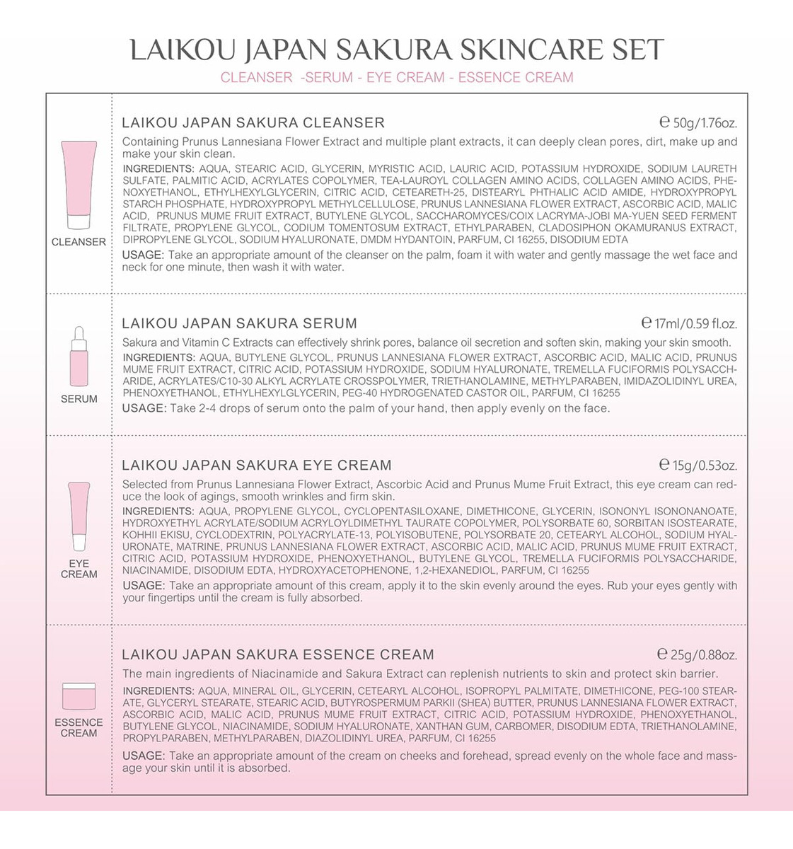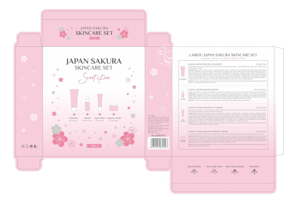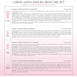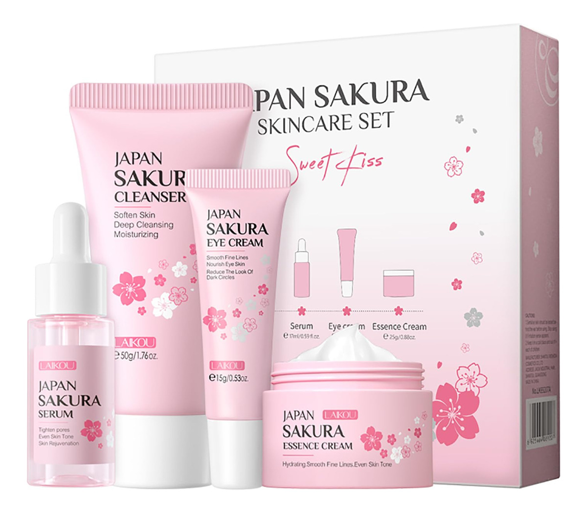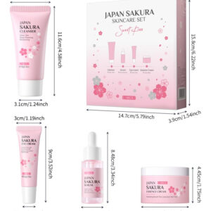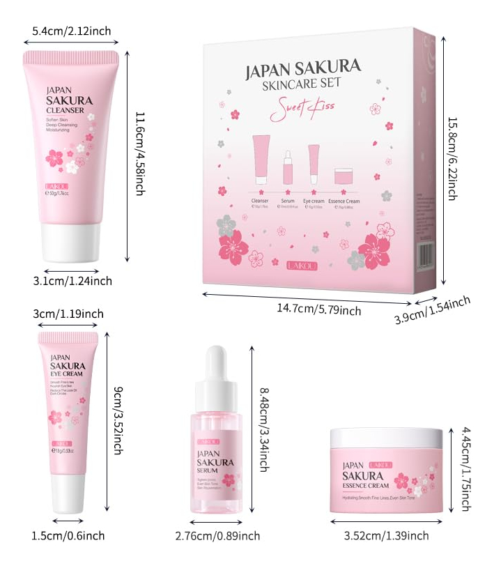 Conjunto de cuidados com a pele Japan SAKURA Beauty Gift Sets Kit de cuidados com a pele com limpador, sérum, creme para olhos e creme facial Kit de viagem para mulheres, mãe, esposa e meninas, limpeza suave da pele, tamanhos adequados para o chá, 5 unidades Por que os cuidados com a pele SAKURA são tão populares? Sakura tem o efeito de rejuvenescer a pele. Pode promover a síntese de colágeno e restaurar a elasticidade da pele. Os produtos para a pele que contêm extrato de sakura podem suavizar eficazmente as rugas. Volume: 17 ml de soro+15 g de creme para os olhos+25 g de creme facial+50 g de limpador Funções: hidratante, hidratante, nutrição da pele após o uso: poros grossos, pele áspera, embotamento, rotina básica de cuidados com a pele: lavagem facial, tônico, soro, creme para os olhos, creme facial, creme facial, creme facial, creme para dormir, pacote: 4 unidades/conjunto de cuidados com a pele Sakura (soro+creme facial+creme para os olhos e limpador) – Processo completo de cuidado facial: o presente de beleza LAIKOU Sakura Skin Set pode atender a tudo o que você precisa para cuidar do rosto: limpador, sérum, creme para os olhos, creme facial. – Limpa e nutre a pele: o kit de viagem de produtos de higiene pessoal é infundido com extrato de flor de cerejeira. Primeiro, use o limpador de flor de cerejeira para limpar o rosto; e depois use a essência de flor de cerejeira para hidratar a pele seca; em terceiro lugar, use soro para os olhos para atenuar as linhas finas; finalmente, finalize com creme facial, para que você possa brilhar de forma mais saudável. – Rico em extrato de flor de cerejeira: as flores de cerejeira têm efeitos hidratantes e hidratantes na pele, contendo vitaminas naturais A, B e E, que podem encolher feche os poros e equilibre a secreção de óleo facial. – Tamanho adequado para viagens: os itens de cuidados com a pele para viagem são todos do tamanho adequado para viagens, e você pode viajar para qualquer lugar com eles! – Conjunto de presentes femininos: no Dia de Ação de Graças, Natal, Dia dos Namorados e Dia das Mães, surpreenda sua mãe, amante, filha e irmãs com o kit de cuidados com a pele facial LAIKOU, oferecendo-lhes beleza e saúde. Imagine a alegria que eles sentirão!