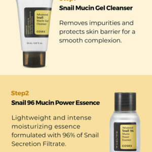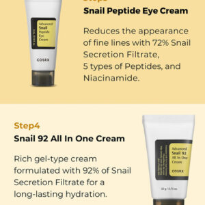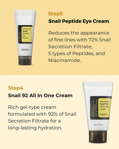 COSRX All About Snail Korean Skincare | Tamanho de viagem aprovado pela TSA, conjunto de presentes com limpador de gel facial, essência, creme e creme para os olhos, kit reparador, recuperador e rejuvenescedor com mucina de caracol, cuidados com a pele coreanos – o kit de teste avançado de caracol de 4 etapas mais popular da COSRX: itens essenciais para a pele formulados com mucina de caracol para reparar, hidratar e suavizar a pele. – Limpador avançado em gel de mucina de caracol (0,67 fl. oz) – Com 10.000 ppm de filtrado de secreção de caracol, ele protege a barreira cutânea e não descasca a pele. – Advanced Snail 96 Mucin Power Essence (1,01 fl. oz) – Leve A essência hidratante, porém intensa, é absorvida muito rapidamente pela pele e maximiza a elasticidade da pele. – Creme avançado para os olhos com peptídeo de caracol (0,16 fl. oz) – Contém 72% de filtrado de secreção de caracol e peptídeos para reduzir olheiras, linhas finas e rugas. – Creme All In One Advanced Snail 92 (0,70 onças) – Com 92% de filtrado de secreção de caracol, ajuda a reparar e acalmar a pele sensibilizada após a ruptura sai reabastecendo a umidade.