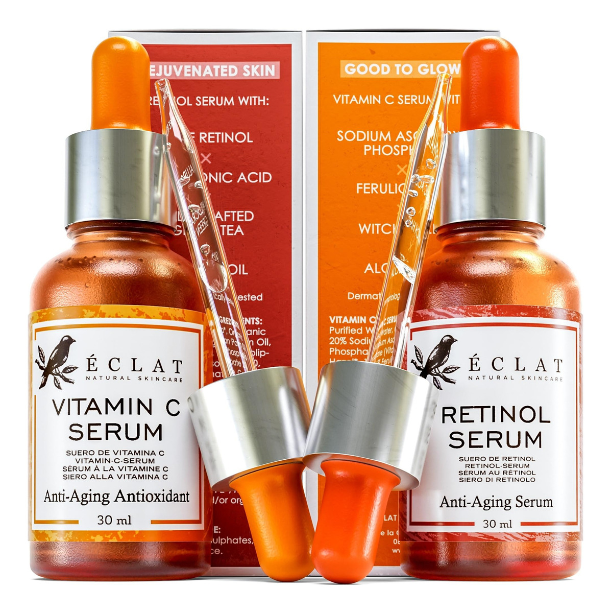 Conjunto de sérum facial Eclat Skincare – Sérum de vitamina C para brilho, sérum de retinol para rugas – -: Nosso conjunto de 2 séruns avançados deixa a pele revitalizada. Nosso sérum de vitamina C enriquecido com antioxidantes aumenta o brilho e ilumina a pele, enquanto nosso sérum de retinol de 2,5% suaviza a aparência das rugas. -: Nossa dupla melhora efetivamente a aparência das rugas, linhas do pescoço, firmeza, elasticidade, textura, poros, manchas, pigmentação, brilho e tom de pele irregular. – – +: Cada sérum é aprimorado com vegetais ricos em antioxidantes, como aloe vera vera, jojoba e camomila para acalmar e reparar. Vitamina E, aloe vera e MSM dobram a eficácia do nosso sérum de vitamina C para promover as habilidades regenerativas da pele e oferecer resultados mais rápidos. – -: Nosso sérum clareador de retinol contém ingredientes naturais que revertem a idade, como vitamina E e ácido hialurônico. É rico em polifenóis e aminoácidos que combatem os sinais mais comuns de envelhecimento. Também adicionamos manteiga de karité e camomila para acalmar e nutrir. – E: Com foco em ingredientes naturais, criamos uma dupla de sérum vegano e livre de crueldade apoiada por dermatologistas para todos os tipos e tons de pele. Nossos séruns são projetados para peles sensíveis e não contêm fragrâncias ou cores sintéticas. -: Bem-vindo à comunidade Eclat! Criamos produtos para a pele simples, mas eficazes, que oferecem resultados comprovados. Nós nos concentramos em ingredientes reconhecíveis e com respaldo clínico que ajudam você a atingir suas metas de cuidados com a pele e a revelar o brilho interior.