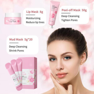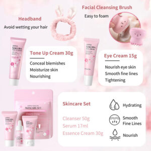 -Conteúdo abrangente do conjuntoComo um conjunto completo de cuidados com a pele feminina, este kit facial sakura inclui máscara de lama, limpe sérum, creme essencial, creme tonificante, creme para os olhos, máscara removível, máscara labial e bandana, um pincel de limpeza facial. É um kit facial perfeito para flores de cerejeira para quem leva a sério