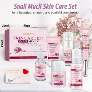 Conjunto de cuidados com a pele de mucina de caracol com removedor de maquiagem, limpador de caracol, tônico de mucina de caracol, sérum de mucina de caracol, creme para olhos com mucina de caracol para hidratar, reparar e acalmar peles sensíveis de longa duração, conjunto de presente de aniversário para mulheres e meninas. — Kit avançado de mucina de caracol: nosso conjunto de cuidados com a pele inclui tudo o que é necessário para uma aparência radiante e jovem: maquiagem Removedor, limpador, hidratante, sérum, tônico, hidratante e creme para os olhos. Sua rotina completa de cuidados com a pele em um kit para reparar, hidratar e suavizar — Suave, mas poderoso: o removedor de maquiagem e o limpador de mucina de caracol proporcionam profundidade efeitos hidratantes e minimiza o estímulo para uma limpeza suave. Remove com eficácia a maquiagem, a sujeira e as impurezas, deixando a pele do rosto revigorada, macia e suave – Leve e não oleosa: nossos produtos para a pele facial são absorvidos rapidamente para hidratar, reparar e suavizar a pele. Desfrute de um brilho saudável sem qualquer sensação de peso ou oleosidade. A mucina de caracol é obtida de forma amigável. Nenhum caracol é prejudicado – Hidrata Reparador e calmante: este conjunto de cuidados com a pele inclui tônico de mucina de caracol, sérum, creme para os olhos, hidratante, todos trabalhando juntos para promover hidratação, acalmar a pele desidratada, reparar danos. Desfrute de uma pele clara e macia com mucina de caracol proveniente da Coreia – Ingredientes principais: alimentada por filtrado de secreção de caracol, ácido hialurônico, glicerina e bisabolol, esta fórmula fortalece efetivamente a barreira cutânea, aumenta a elasticidade e a firmeza e repõe a umidade para rejuvenescer e revitalizar a pele seca e envelhecida – Feliz presente para qualquer ocasião: O conjunto de presentes para cuidados com a pele é suave, mesmo para peles sensíveis. Ótimo como presente de Natal para mulheres, presentes de aniversário para mulheres, presentes de dia dos namorados para ela, presente de Dia das Mães, seja para esposa, mãe, filha, irmã, melhor amiga