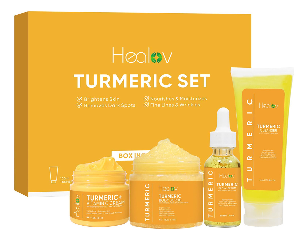Se você usa cuidados com a pele com açafrão para manchas coloridas ou cuidados com a pele com açafrão para acne no rosto ou no corpo, nossos produtos para a pele com açafrão são exatamente o que seu regime de pele saudável exige. Com uma coleção de nossos produtos de pele de açafrão mais vendidos, este conjunto de 4 peças de cuidados naturais para a pele tem tudo o que você precisa. O kit de cuidados com a pele com açafrão inclui: – 1,67 onças de creme facial de açafrão com vitamina C – 6,35 onças de esfoliante de cúrcuma – 1 oz de sérum facial de açafrão com aloe – 3,3 onças de limpador de pele de açafrão com aloe. BENEFÍCIOS DO AÇAFRÃO. O cuidado com a pele ilumina as olheiras e ajuda a impedir o crescimento de bactérias, reduz a coceira e a inflamação, tonifica a pele para deixá-la brilhante e aumenta os microorganismos a circulação na pele protege a pele contra poluentes, estimula a produção de colágeno. Use os produtos de beleza de açafrão contidos neste conjunto de cuidados com a pele em caixa como cuidados antienvelhecimento, cuidados com a pele anti-acne ou cuidados com a pele que iluminam a pele. A cúrcuma é naturalmente rica em propriedades defensivas e nutrientes que comprovadamente previnem o envelhecimento prematuro, aceleram a reparação de feridas, combatem a acne, diminuem as marcas e muito mais. Nós aqui na Healov temos profundo orgulho da qualidade de nossos produtos. Enriquecido com 100% de açafrão, cada mistura é feita meticulosamente com extremo cuidado. Sem aditivos químicos. Sem parabenos. Sem OGM. Sem sulfatos. Absolutamente nenhuma. Simplesmente todos os produtos naturais de cúrcuma para a pele que sua pele vai adorar. Hidratantes, não secantes, sem parabenos e sem ftalatos, nossos produtos para a pele são tão puros e suaves quanto possível. Prepare-se para se surpreender. Usar os produtos deste pacote de aumento de brilho para seu regime diário de cuidados com a pele melhorará o tom, a textura e o nível de brilho da pele opaca, seca ou danificada. Descubra as propriedades curativas e corretivas da cúrcuma. Clique em ADICIONAR AO CARRINHO para solicitar seu kit de pele! – 4 PRODUTOS DE CÚRCUMA PARA A PELE: Nosso conjunto de pele de açafrão inclui sabonete facial com açafrão, esfoliante corporal com açafrão, sérum facial de açafrão e creme de açafrão. Todos os produtos para a pele com açafrão que você precisa para revelar e manter uma pele brilhante! – CUIDADOS COM A PELE PARA ROSTO E CORPO: este conjunto de cuidados com a pele para clarear a pele apresenta produtos de açafrão para rosto e corpo para ajudar na descoloração, estrias ou manchas no pescoço, peito, costas, parte interna das coxas, áreas íntimas, etc. – OS BENEFÍCIOS DA CÚRCUMA: a cúrcuma ilumina a pele, protege a pele, reduz as olheiras, acalma e previne a coceira causada por eczema ou psoríase, ajuda com acne, ajuda a diminuir a aparência de marcas e muito mais. – FÓRMULAS PURAS E NATURAIS: Todos os nossos remédios tópicos para a pele com açafrão são feitos de forma responsável com ingredientes puramente naturais e verdadeiramente saudáveis. Suaves e seguros para todos os tipos de pele, eles reparam e nutrem a pele sem ressecá-la. — É uma ótima ideia de presente: contendo 4 produtos para a pele com açafrão em tamanho real, este conjunto de cuidados com a pele da cabeça aos pés é uma ideia fabulosa de presente para você ou outra pessoa. Presenteie uma pele mais brilhante e bonita com Healov!