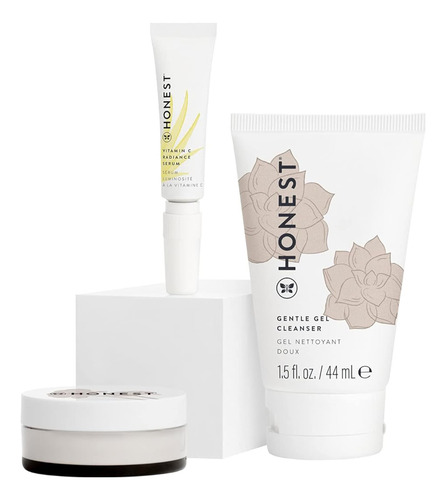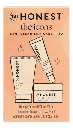 Honest Beauty The Icons Skincare Trio | Mini creme de hidrogel, limpador de gel suave, sérum radiante com vitamina C | Verificado pelo EWG, vegano e livre de crueldade — Combinação perfeita de 3 etapas para viagens — Inclui o Gentle Gel Cleanser Mini, o Vitamin C Radiance Serum Mini e o Hydrogel Mini — Pele limpa, hidratada e com aparência úmida diariamente — Certificado EWG e livre de crueldade — Papel 100% livre de cuidados com árvores feito com: creme de hidrogel: 2 tipos de ácido hialurônico, gel de limpeza suave de esqualano: extratos de camomila e calêndula, sérum radiante de vitamina C: vitamina C, ácido hialurônico, refletor de luz Pérola — FEITA SEM: parabenos, ftalatos, BHT, óleo mineral, fragrâncias sintéticas, corantes sintéticos