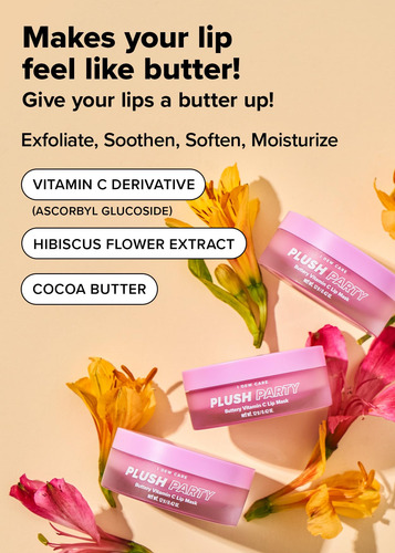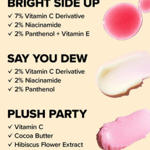 – INGREDIENTES HERÓIS: 7% de derivado de vitamina C para melhorar o brilho da pele (Bright Side Up) 2% de niacinamida para uniformizar o tom da pele e iluminar a pele sem ressecamento (Say You Dew) Manteiga de cacau rica em antioxidantes para promover a elasticidade dos lábios (Plush Party).