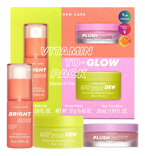 Trio de produtos ricos em vitamina C que inclui sérum para viagem Bright Side Up 15 ml/0,50 fl oz., hidratante Say You Dew 30 ml/0,50 fl oz. e máscara labial Plush Party 12 g/0,42 oz para iluminar e hidratar a pele em qualquer lugar. – WHO IS I DEW CARE: Seriously Fun Skincare. Criamos fórmulas divertidas que funcionam seriamente. Beleza K que induz sorrisos para ela, ele, eles e todos.
