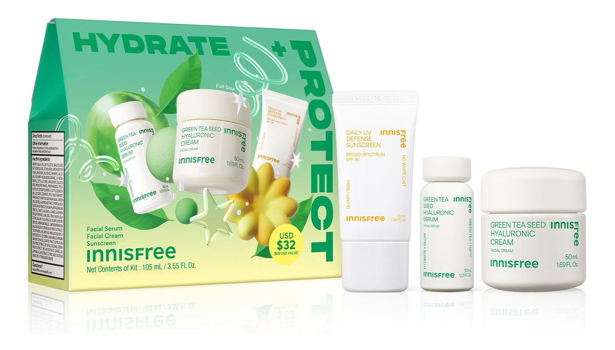 Conjunto Innisfree Holiday Hydrate and Protect: protetor solar UV diário em tamanho real — Nosso conjunto de produtos favoritos para viagens para pele hidratada e protegida, onde quer que você vá.