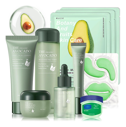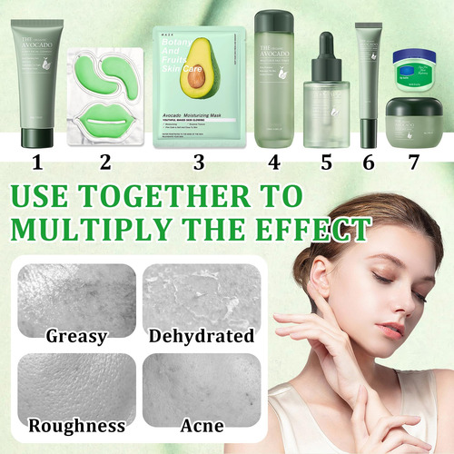 – Conjuntos de cuidados com a pele facial de abacate: o kit hidratante para a pele contém 8 produtos hidratantes diários indispensáveis, incluindo limpador, tônico, soro facial, creme facial, creme para os olhos, protetor labial hidratante, tapa-olho, máscara labial e máscara facial hidratante, que podem satisfazer todas as suas necessidades de cuidados com a