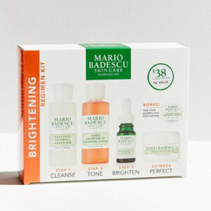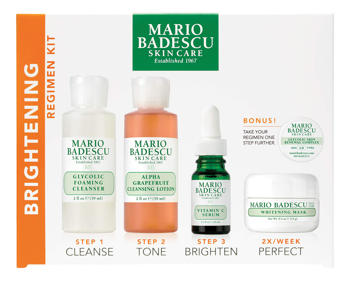 Mario Badescu The Brightening Kit, kit de 5 peças com limpador de espuma glicólica, loção de limpeza de toranja alfa, sérum de vitamina C, máscara clareadora e complexo glicólico de renovação da pele – OBTENHA AQUELE BRILHO JUVENIL – Revele uma tez mais brilhante e mais jovem. Esta coleção de produtos para cuidados com a pele facial repleta de ingredientes poderosos que aumentam o brilho – ESFOLIA – Nosso kit de clareamento facial ajuda você esfolie suavemente para melhorar o tom da pele e atenuar a hiperpigmentação e os danos causados pelo sol; o limpador facial glicólico faz o trabalho com eficácia para você – REGIME COMPLETO – Os favoritos dos clientes selecionados a dedo, feitos especialmente para iluminar sua pele; definitivamente vale a pena se você está começando uma rotina de cuidados com a pele ou quer experimentar um novo conjunto de cuidados com o rosto – TRAVEL ESSENTIALS – Esta coleção vem em tamanhos convenientes para um kit de cuidados faciais de viagem; você nunca precisará ir a lugar nenhum sem um conjunto de cuidados com a pele que ajude a manter sua aparência fresca e brilhante – CONFIÁVEL – Nossos conjuntos e kits de cuidados com a pele são orgulhosamente isentos de crueldade e feitos no EUA