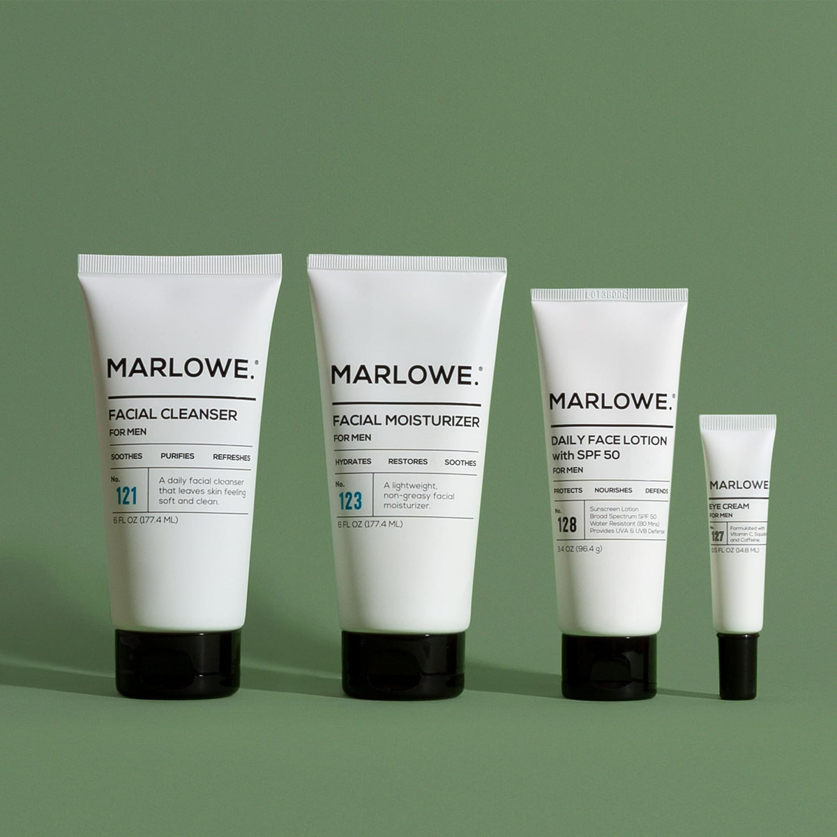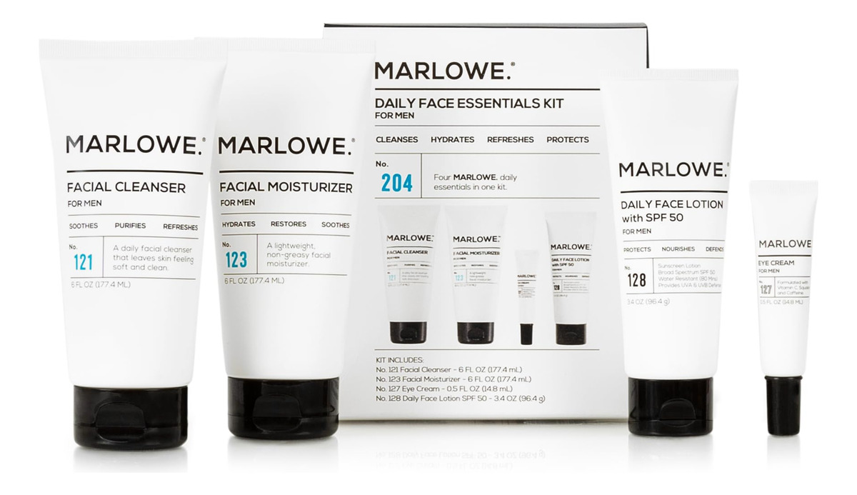 MARLOWE. Conjunto masculino de cuidados com a pele, kit essencial diário nº 204, inclui limpador facial, hidratante facial, creme para os olhos e loção facial diária com SPF 50. Damos as boas-vindas a um novo mundo de limpeza e capacidades superiores de higiene. A melhor parte? MARLOWE. é tão fácil de usar quanto eficaz. Aguarde sua rotina diária de higiene pessoal e sinta-se revigorado antes de enfrentar o dia. À noite, volte para casa com produtos resistentes o suficiente para passar o dia e reabastecer para amanhã. Limpador facial diário Use este limpador facial para se livrar do óleo e das impurezas e se sentir mais fresco. Comece e termine seu dia com MARLOWE. sabonete facial masculino de limpeza. Hidratante facial hidratante e loção facial diária com SPF 50 Após a limpeza, aplique uma fina camada desse hidratante leve à base de água para reabastecer a pele, deixando o rosto macio e revigorado. Nossa loção facial masculina sem óleo com protetor solar SPF 50 é feita com aloe vera e manteiga de karité para reter a umidade e ajudar a suavizar a pele sem deixar a sensação de oleosidade posterior. Resistente à água e ao suor por 80 minutos. Creme reafirmante e hidratante para os olhos Selecionamos cuidadosamente cada ingrediente para ajudar a reduzir rugas e bolsas na pele delicada ao redor da área dos olhos. Leve e de rápida absorção, este creme de olhos para homens hidrata e acalma, reduzindo os sinais de envelhecimento. Livre de produtos químicos agressivos na MARLOWE. nossos produtos práticos são livres de produtos químicos agressivos, como ftalatos, SLS/SLES e parabenos. Livres de crueldade (nunca testados em animais) e são feitos aqui mesmo nos EUA. Portanto, cuidar da pele não precisa mais ser complicado. MARLOWE. cria produtos que funcionam tanto quanto você. – Lavagem facial diária: um ótimo dia começa e termina com um rosto limpo. É simples – use este limpador facial para se livrar do óleo e das impurezas e se sentir ainda mais fresco. P.S. Pare de usar sabonete líquido no rosto. Eles são diferentes. Um sabonete facial simples e eficaz – Hidratante facial hidratante: não fique com a pele seca e escamosa do rosto, ela não parece nem se sente bem. Após a limpeza, use este creme facial hidratante leve, não comedogênico e à base de água para reabastecer a pele, deixando seu rosto macio e revigorado – Hard Working Under Eye Cream: Então você não tem mais 21 anos. Isso acontece com os melhores de nós. Se você está sentindo um pouco de inchaço, olheiras ou outras coisas que não lembra de ter estado lá, definitivamente é hora deste creme renovador para os olhos – Loção facial hidratante com SPF 50: não subestime o poder do sol em seu dia normal. Proteja sua pele com esta loção facial diária não comedogênica com SPF 50 todos os dias. Isso ajudará a proteger sua pele contra danos, evitando o envelhecimento precoce da pele – Sem coisas ruins e feitos aqui: MARLOWE. Os produtos para cabelos e cuidados com a pele são livres de SLS, SLES, parabenos e ftalatos, livres de crueldade e fabricados nos EUA com ingredientes de origem global. Produtos essenciais para cuidados com o rosto, o barbear e o corpo de alta qualidade, projetados para elevar seu estilo de vida