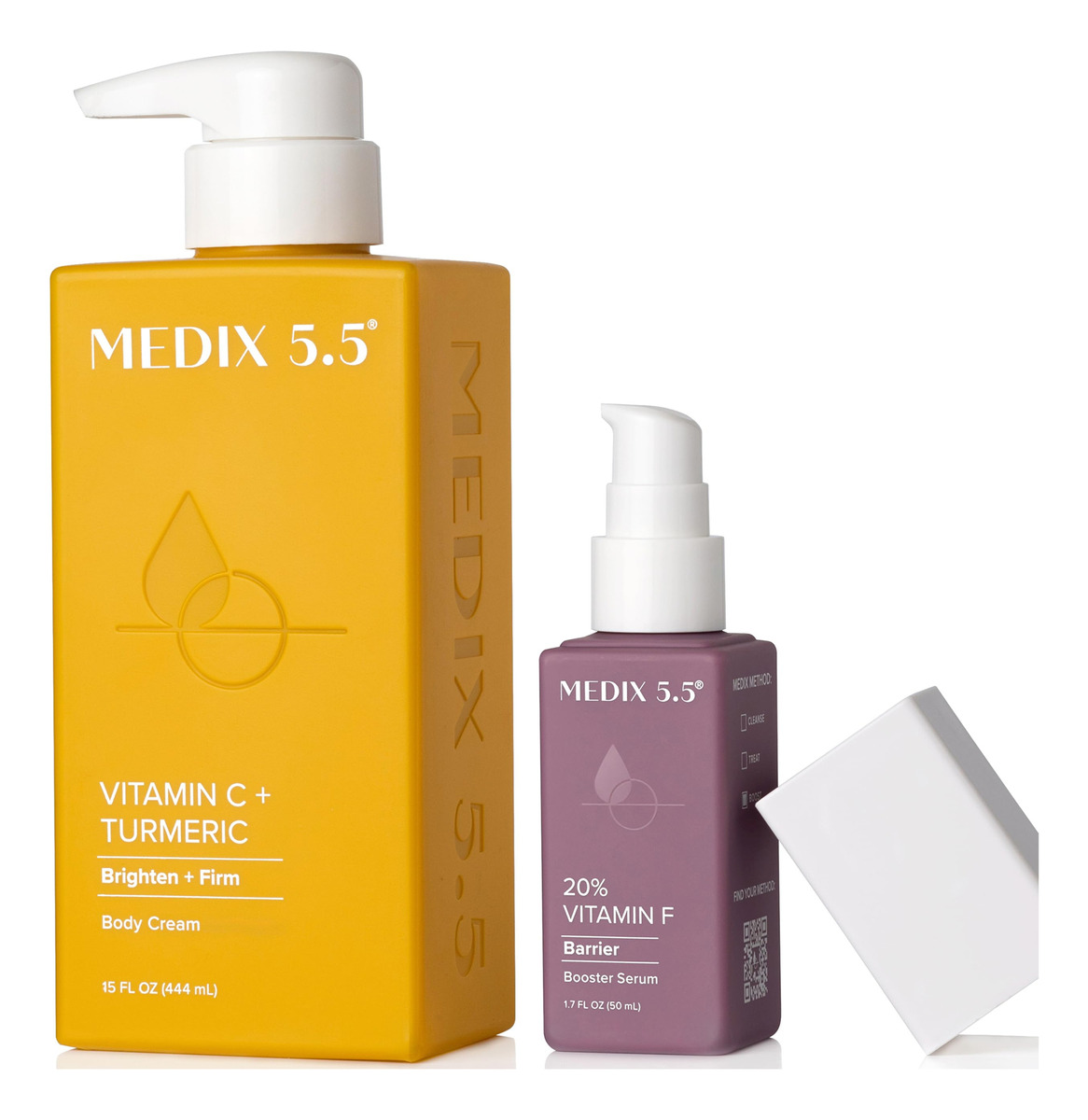 Creme de vitamina C MEDIX e soro de reforço de vitamina F, conjunto de 2 peças para cuidados com a pele | Creme reafirmante e iluminador que diminui o tom de pele irregular, manchas da idade, pele seca e danos causados pelo sol, pacote de 2 unidades – CREME DE VITAMINA C Incorporar uma loção corporal com infusão de vitamina C em sua rotina diária de cuidados com a pele pode ajudar a promover uma tez mais saudável, radiante e jovem. A vitamina C ajuda a promover um tom de pele uniforme, ao mesmo tempo que ajuda a estimular a produção de colágeno para melhorar a elasticidade e firmeza da pele. A vitamina C também ajuda a minimizar a vermelhidão ou irritação na pele, ajuda a proteger contra estressores ambientais, como os raios UV, e ajuda a reduzir a aparência de rugas, linhas finas e danos causados pelo sol. – O QUE É VITAMINA F? Não comumente encontrada em produtos para cuidados com a pele, a vitamina F é a combinação de dois ácidos graxos essenciais: ácido linolênico e ácido linoléico, que oferecem uma grande variedade de benefícios para o cuidado da pele. A vitamina F tem uma série de benefícios para nossa pele, desde proteger, restaurar e hidratar a pele até mantê-la calma e dar-lhe brilho. A vitamina F é extremamente benéfica para proteger a barreira cutânea e ajudar a pele a reter a umidade para reduzir a aparência de pele crepitante, estrias e muito mais. – INGREDIENTES EFICAZES A loção corporal Cream Brighten + Firm é formulada com a combinação perfeita de ingredientes antienvelhecimento e clareadores eficazes, incluindo manteiga de karité, aloe vera, ácido ferúlico, açafrão, vitamina E, glicerina, gengibre e muito mais. A manteiga de karité hidrata profundamente a pele, melhora a elasticidade e fornece uma barreira protetora para ajudar a evitar a perda de umidade. A vitamina E ajuda a proteger a pele contra os radicais livres e os danos causados pelos raios UV. Aloe Vera ajuda a acalmar e hidratar a pele. – BOOSTER Fortaleça sua rotina diária regular de cuidados com a pele adicionando este sérum intensificador de vitamina F altamente concentrado, formulado para ser combinado com seu creme de tratamento corporal Medix 5.5 favorito. Uma bomba hidratante rica em vitamina F repõe a pele seca e firme, ajuda a proteger a pele contra o envelhecimento prematuro e apoia uma barreira cutânea saudável. Compatível com todos os tipos de pele, até mesmo pele sensível e pele propensa a acne. Fórmula sem fragrância, testada por dermatologistas, testada contra alergias e clinicamente testada. – BRIGHTEN & RENEW Vegan + Cruelty Free. Livre de: parabenos, álcoois secantes, ingredientes de origem animal, PEGs, sulfatos, corantes, propilenoglicol, óleo mineral e talco. Fabricado em nosso laboratório inspecionado pela FDA em Chicago, EUA. Testado por dermatologistas, testado clinicamente e testado contra alergias. NOTA: O creme de vitamina C Medix pode desbotar ligeiramente do branco com o tempo devido ao ácido ascórbico. Isso é envelhecimento natural e não afeta a qualidade da fórmula ou a eficácia dos ingredientes.