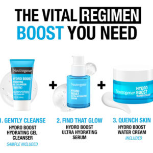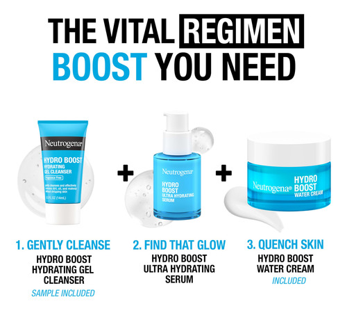 Conjunto de cuidados com a pele Neutrogena Hydro Boost, hidratante facial Hydro Boost Water Cream para 72 horas de hidratação, 1,7 fl oz e gel hidratante Hydro Boost, tamanho experimental, 0,5 fl oz, pacote com 2 pacotes — pacote de cuidados com a pele Hydro Boost da Neutrogena, uma marca recomendada por dermatologistas, com um frasco de vidro reciclável de 1,7 onças de Hydro Boost sem perfume Creme hidratante de água e gel de limpeza hidratante Hydro Boost, tamanho experimental, de 0,5 onça fluida — O hidratante facial e o sabonete facial espumante sem fragrância contêm ácido hialurônico purificado, um hidratante essencial encontrado naturalmente em pele. O limpador e hidratante não comedogênico são livres de fragrâncias, parabenos, ftalatos e corantes – o creme de água repõe profundamente o conteúdo vital de água na superfície da pele e oferece 9 vezes mais hidratação (em comparação com a pele não tratada) para uma pele macia e úmida. O creme facial fornece hidratação clinicamente comprovada por 72 horas para melhorar a aparência da pele seca – O limpador facial se transforma em uma espuma sedosa para remover maquiagem, sujeira, óleo e impurezas da pele, deixando-a macia e flexível. Ele limpa suavemente e completamente e está clinicamente comprovado que aumenta a hidratação da pele e a retém