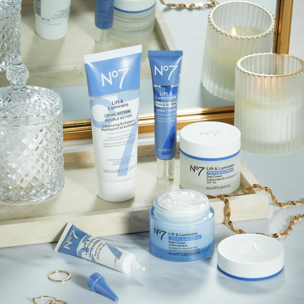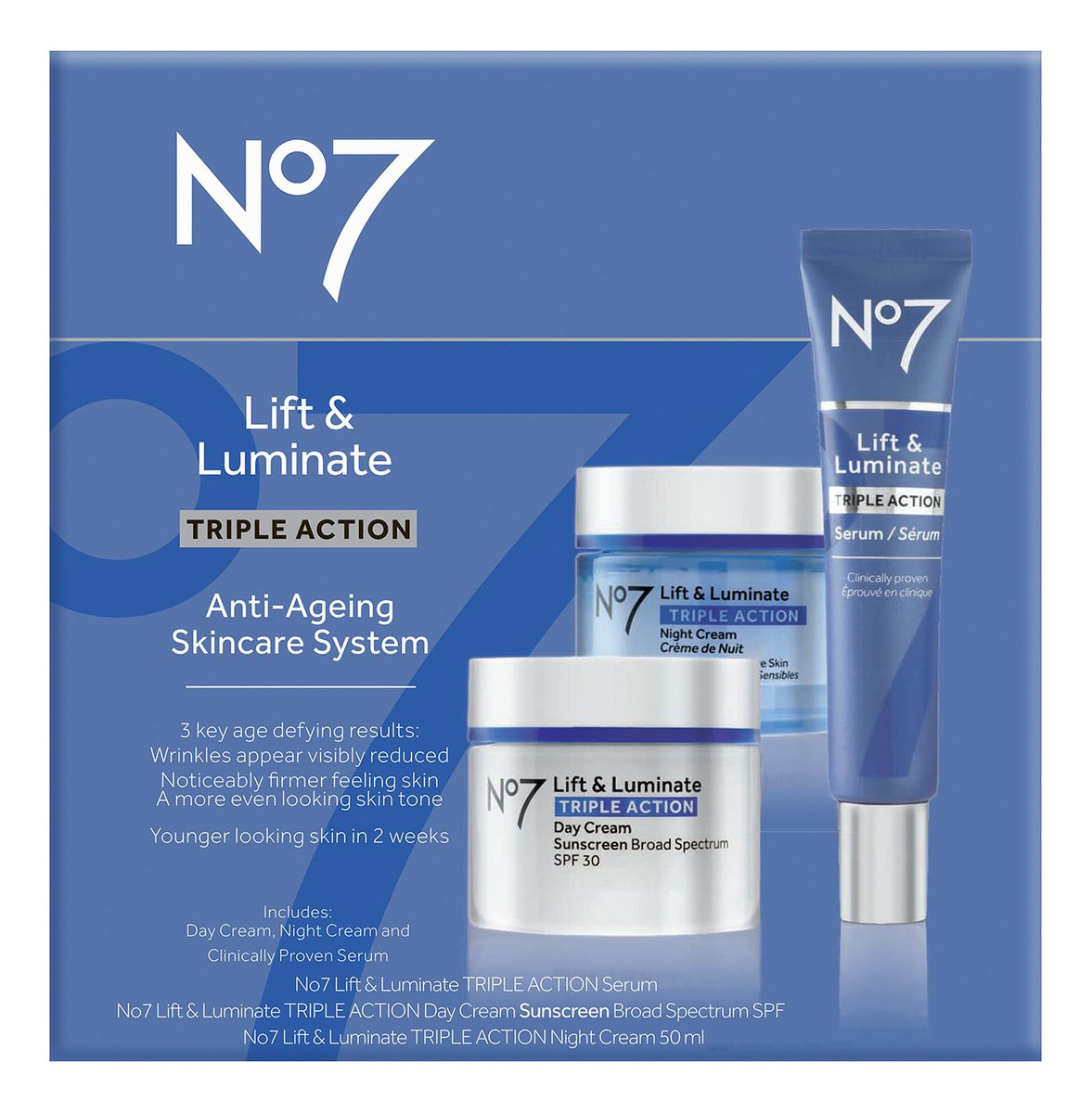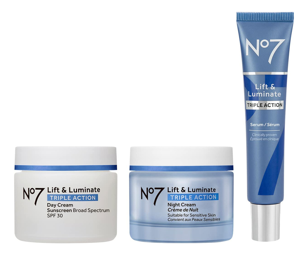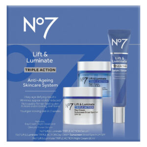 Descubra uma tez mais brilhante e mais jovem com o sistema de cuidados com a pele Lift & Luminate Triple Action de 3 peças. Este conjunto de cuidados com a pele antienvelhecimento ajuda a aumentar o brilho e a firmeza da manhã à tarde. – Este conjunto de cuidados com a pele antienvelhecimento ajuda a aumentar o brilho e a firmar a pele da manhã à noite. – Creme de dia de ação tripla Lift and Luminate – Um creme facial diário com SPF. O creme de dia antienvelhecimento que você conhece e adora. Está comprovado que este hidratante facial SPF 30 reduz os principais sinais de envelhecimento com ingredientes avançados. – Sérum facial Lift and Luminate – Fortaleça sua pele com este sérum reafirmante e iluminador intensivo, infundido com uma mistura de antioxidantes, peptídeos e nosso exclusivo complexo de colágeno. – Creme noturno Lift and Luminate – As rugas são visivelmente reduzidas, a pele parece levantada e visivelmente mais firme e o tom da pele é ainda mais depois de usar este creme clareador com nosso complexo exclusivo de colágeno para uma pele mais firme. – Empoderando mulheres desde 1935 – No7 oferece mulheres beleza luxuosa e glamourosa a um preço acessível. Nossos produtos dão às mulheres o apoio, a confiança e o impulso para viver a vida em seus próprios termos.