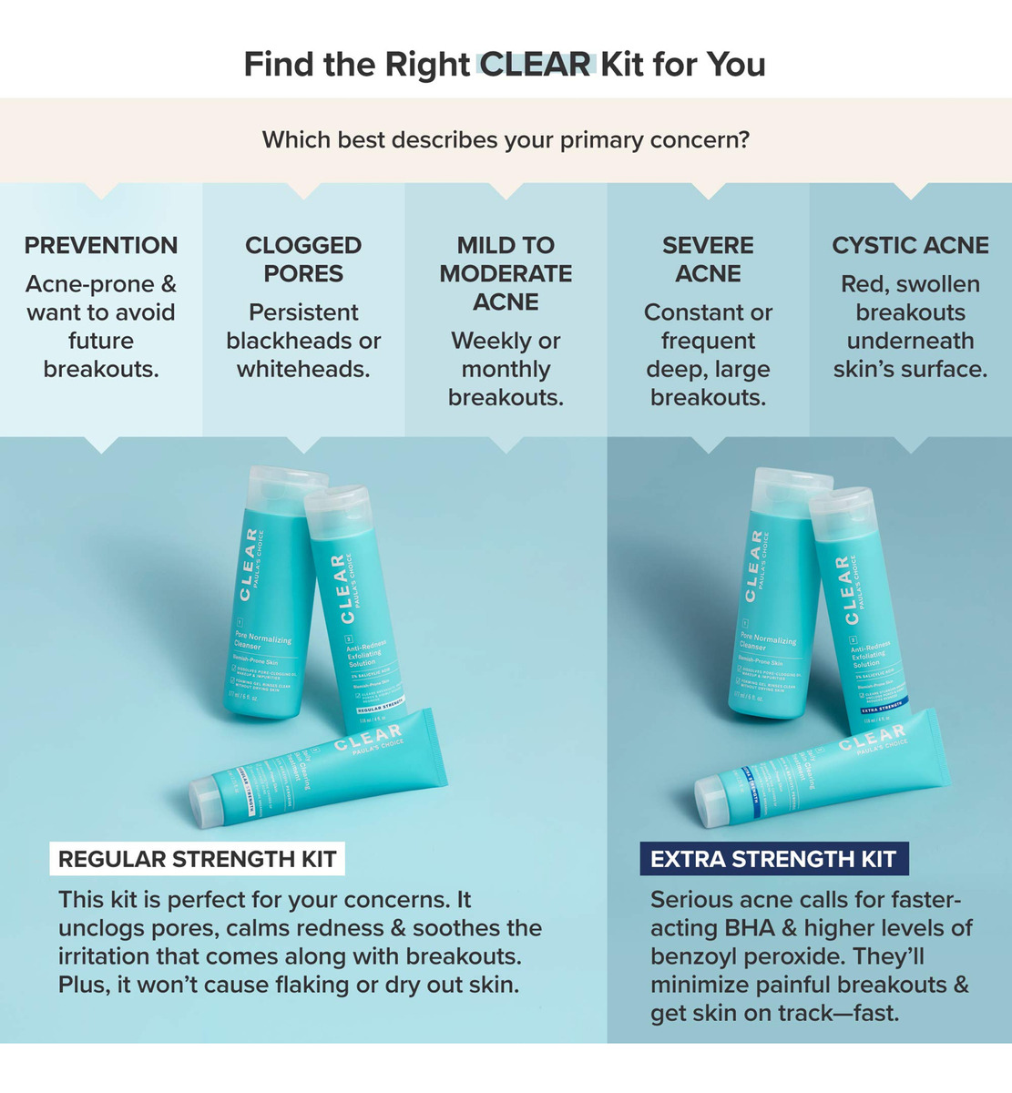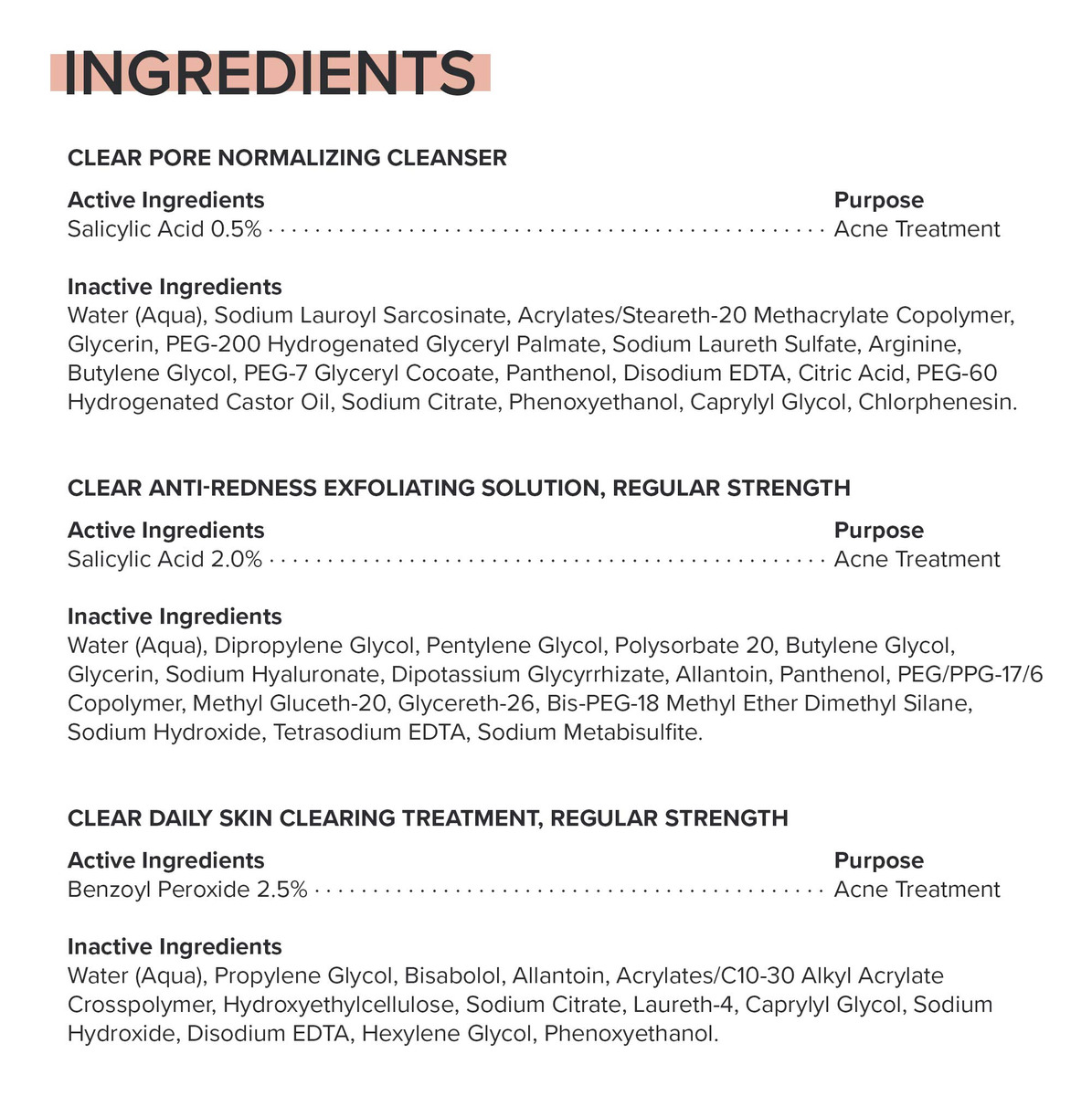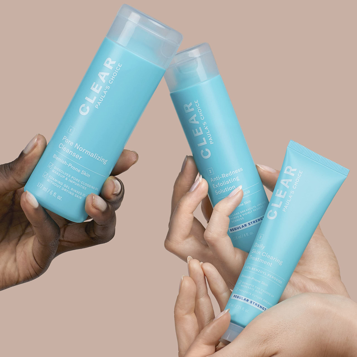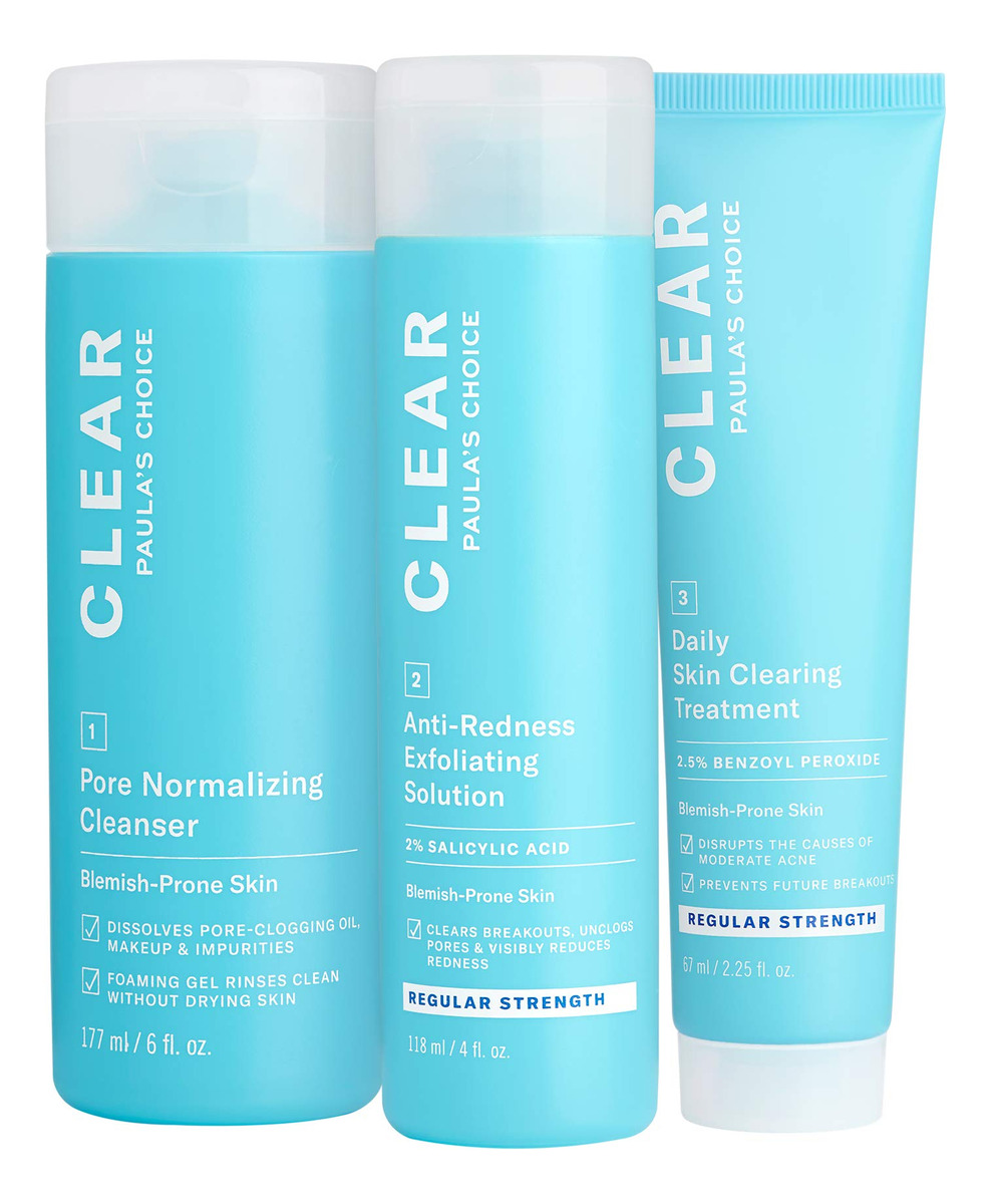 Suave, mas eficaz, anda de mãos dadas com essa rotina simples de usar, de 3 etapas, que controla rapidamente a acne leve a moderada sem causar ressecamento, descamação, vermelhidão ou desconforto. Os produtos do nosso CLEAR Regular Strength Kit trabalham juntos para proporcionar benefícios de aperfeiçoamento da pele, limpeza dos poros e hidratação. Use diariamente para manter seus resultados com sucesso. Todos os produtos deste kit funcionam para diminuir o excesso de oleosidade, desobstruir os poros, diminuir os poros dilatados, desalojar cravos e ajudar a controlar surtos de acne leves a moderados e mantê-los sob controle. Ao contrário de muitos produtos para acne, nossa coleção CLEAR funciona sem causar ressecamento ou vermelhidão e sem expor a pele a ingredientes agressivos. Todos os produtos Paulas Choice são 100% livres de fragrâncias, clinicamente comprovados como não irritantes e nunca foram testados em animais. A EMBALAGEM PODE VARIAR. — SISTEMA DE COMBATE À ACNE FÁCIL DE USAR: Este sistema de cuidados com a pele em 3 etapas funciona rapidamente para combater e controlar a acne persistente, erupções cutâneas, manchas e cravos — tudo isso sem causar ressecamento ou vermelhidão. Com o tempo, ele efetivamente desobstrui e minimiza a aparência dos poros, melhorando os sinais de sensibilidade. A embalagem pode variar. — O kit Paula's Choice CLEAR Regular Strength Acne contém 3 produtos: limpador normalizador de poros CLEAR, solução esfoliante antivermelhidão CLEAR Regular Strength com 2% de ácido salicílico (BHA) e tratamento diário de limpeza de pele CLEAR Regular Strength com 2,5% de peróxido de benzoíla. É adequado para peles normais, secas, oleosas e mistas, incluindo peles com tendência à acne cística. – Essas fórmulas leves são suaves, mas resistentes a erupções cutâneas, poros dilatados e acne. Eles trabalham juntos para proporcionar benefícios de aperfeiçoamento da pele, limpeza dos poros e hidratação. Use como rotina diária de cuidados com a pele de manhã e à noite para ver e manter os melhores resultados. Sempre termine com SPF 30+ pela manhã. – A coleção Paula's Choice CLEAR também inclui nosso fluido hidratante diário ultraleve SPF 30+ para o dia, o hidratante sem óleo CLEAR para hidratação leve e a máscara de argila purificante CLEAR para controlar o excesso de brilho e poros entupidos. – A Paula's Choice Skincare fabrica produtos que funcionam. Sem fragrância, sem parabenos, sem penugem. Apenas fórmulas eficazes e baseadas na ciência que abordam qualquer problema, desde rugas até erupções cutâneas.