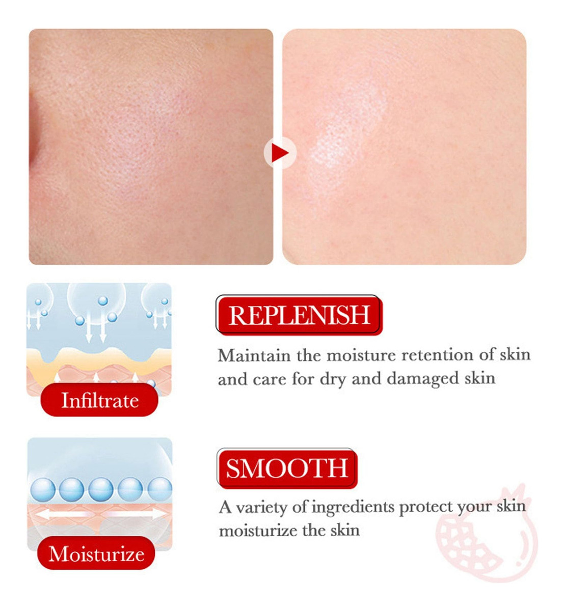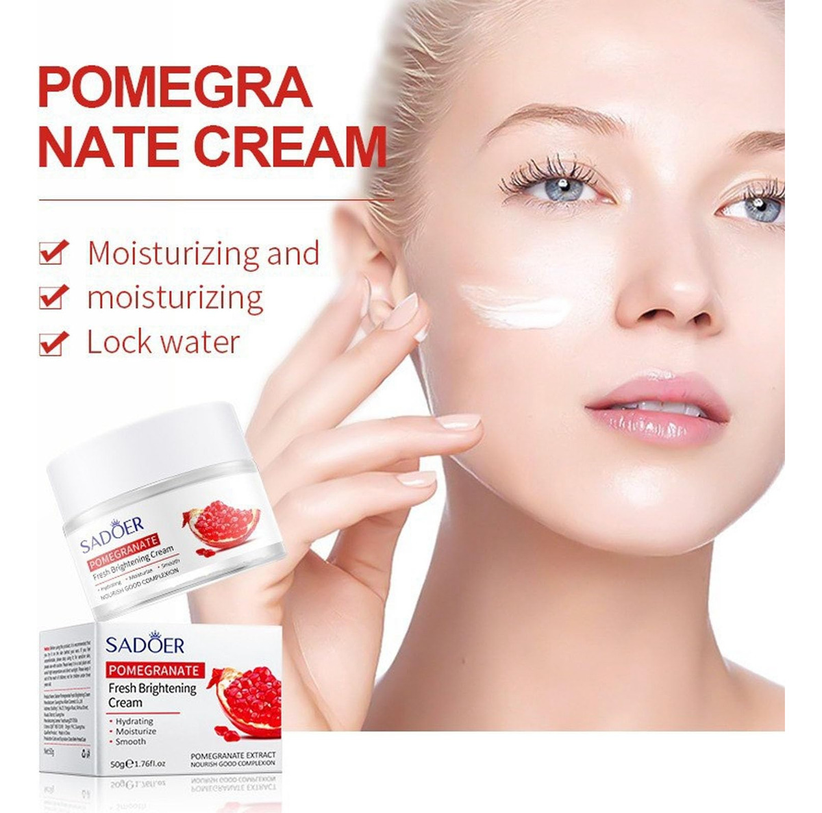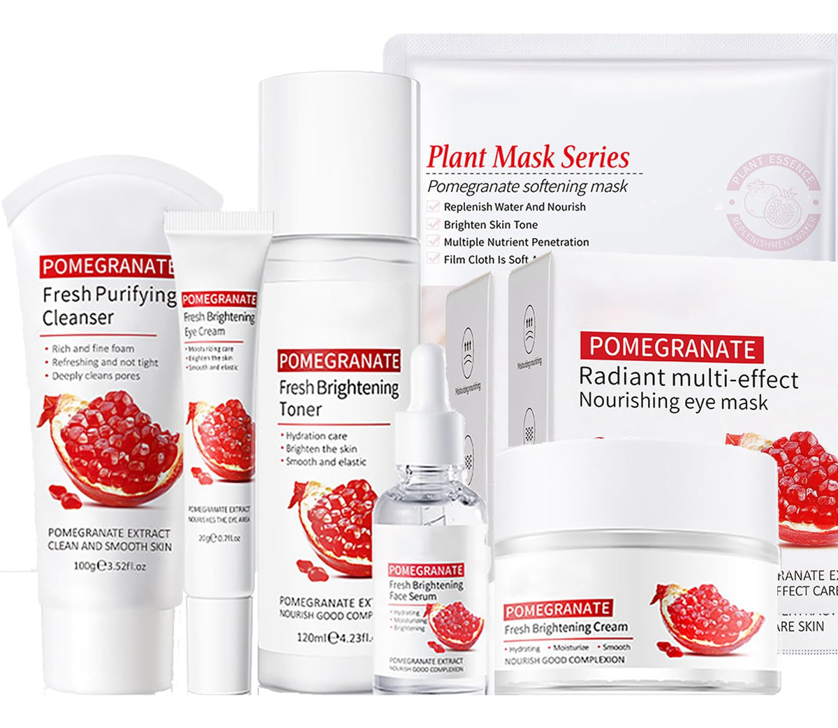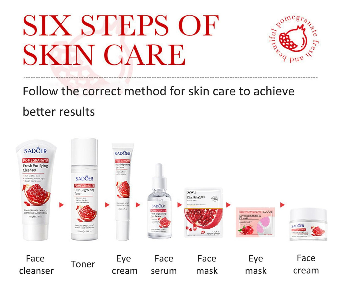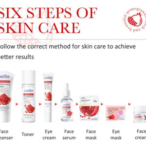 O conjunto de cuidados com a pele de romã vermelha de 7 peças inclui 1. Limpador facial 100g 2. Tônico 120ml 3. Essência facial 30ml 4. Creme para os olhos 30g 5. Creme facial 50g 6. Máscara facial 25g 7. Máscara de olhos 7,5 g Este conjunto de cuidados com a pele vem com todos os seus itens hidratantes essenciais favoritos: 1. O limpador facial remove suavemente impurezas, óleos e cosméticos residuais, nutrindo a pele; 2. O toner pode remover o excesso de óleo e hidratar a pele; 3. O soro facial pode melhorar os defeitos e até mesmo a cor da pele; 4. O creme facial pode minimizar a aparência de linhas finas e manchas, suavizar rugas profundas e manter a pele hidratada por muito tempo; 5. O creme para os olhos pode hidratar profundamente, ajudar a pele a reter a umidade, suavizar os pés de galinha e as linhas finas e melhorar as olheiras sob os olhos; 6. As máscaras para os olhos ajudam a suavizar os pés de galinha e as linhas finas, melhoram as olheiras sob os olhos; 7. Máscara facial: hidratante profunda, macia e úmida. Hidratação profunda diária: 1. O conjunto de cuidados com a pele de romã vermelha pode reparar eficazmente a pele seca, melhorar a pele opaca, atenuar as manchas, reduzir os poros e manter a umidade e o brilho da pele por muito tempo. 2. Este conjunto hidratante para a pele é rico em extrato de semente de romã, que pode nutrir profundamente a pele e hidratar a pele seca. A textura é lisa, não gordurosa e fácil de absorver. 3. Uma combinação de creme para os olhos e máscara para os olhos, nutre e hidrata profundamente, retém a umidade, melhora a elasticidade da pele dos olhos e reduz os pés de galinha e as rugas. – Conjunto completo de cuidados hidratantes para a pele – O conjunto de cuidados com a pele 7 em 1 tem todas as suas necessidades hidratantes favoritas: limpador facial, tônico, sérum facial, creme para os olhos, creme facial, máscara facial e máscara para os olhos. Usar este kit de cuidados com a pele passo a passo todos os dias fará com que seu rosto fique macio, hidratado e suave. – Conjunto de hidratação profunda para a pele – Nossos conjuntos de presentes de beleza são um conjunto hidratante facial rico em extrato de semente de romã, que injeta ácido hialurônico e glicerol na pele seca para reter a umidade e a hidratação duradoura, permitindo que sua pele alcance um estado de hidratação perfeito. – Kits de cuidados com a pele seca Nosso conjunto de cuidados com a pele antienvelhecimento é uma das melhores opções para você evitar sinais de envelhecimento, melhorando efetivamente a pele opaca e seca, reduzindo as rugas, apertando a pele e escondendo os poros! Este kit facial suave é adequado para todos os tipos de pele de homens e mulheres, incluindo pele neutra, seca, oleosa e sensível. – Conjunto de presente perfeito para mulheres jovens – Nosso kit de cuidados faciais é um presente ideal para meninas, mulheres, familiares, entes queridos e amigos no Natal, Dia dos Namorados, Dia das Mães, Dia de Ação de Graças e aniversários! Experimente, deixe nosso conjunto de presentes para cuidados com a pele mimados lhe trazer beleza e deixá-la mais confiante!