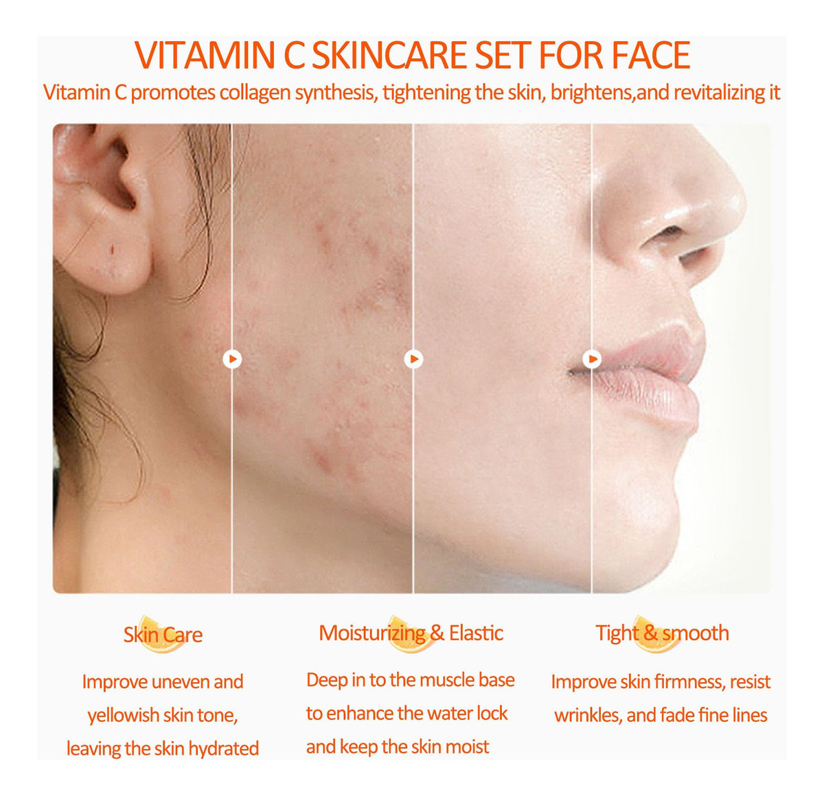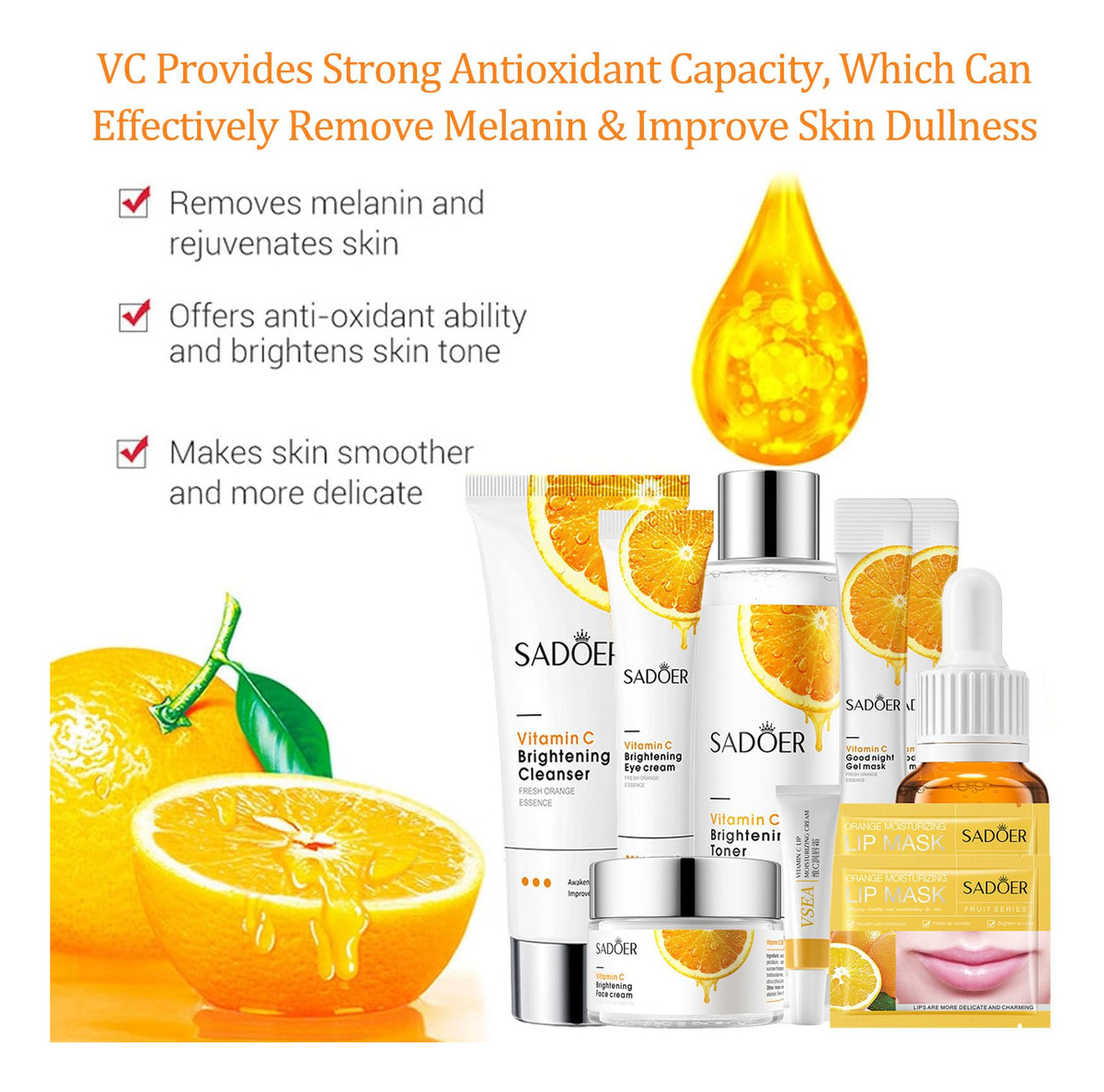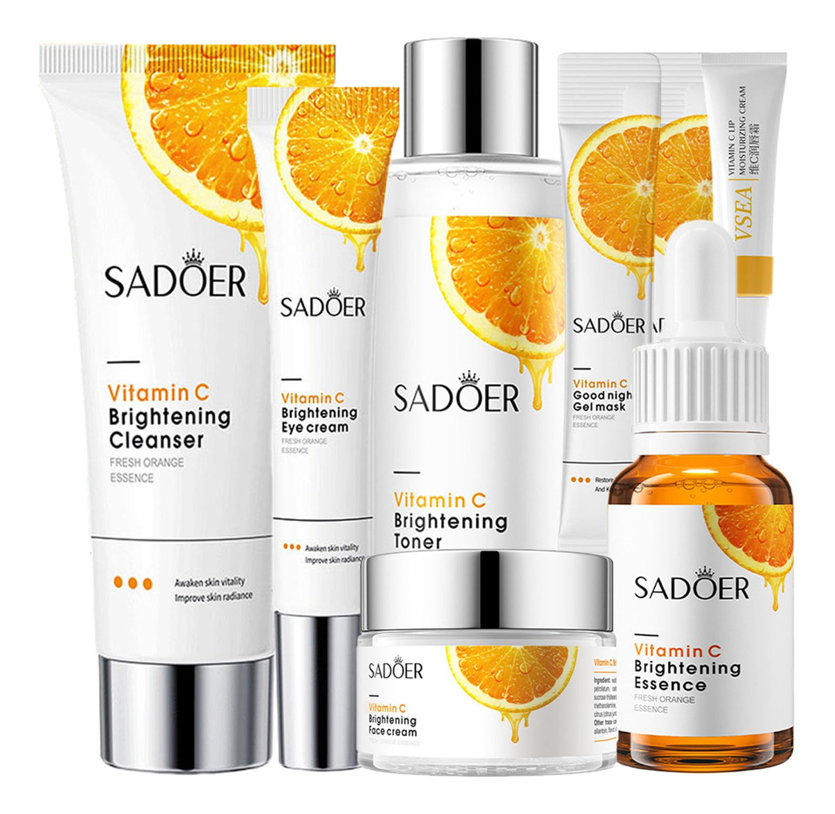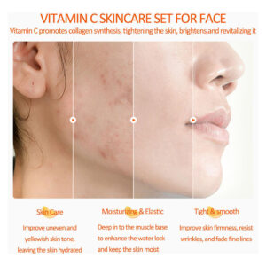 O conjunto completo de cuidados faciais inclui limpador facial 100 g * 1 tônico facial 120 ml * 1 essência facial 30 ml * 1 creme facial 50 g * 1 creme para os olhos * 20 g * 1 máscara facial para dormir, 4 ml * 2 protetor labial 10 g * 1 Este conjunto progressivo de cuidados com a pele fará com que seu rosto fique macio, hidratado, suave e delicado. 1. Bálsamo labial para cuidar dos lábios durante o dia: use batom para hidratar e proteger seus lábios. À noite: use como máscara labial para nutrir e cuidar profundamente dos lábios, melhorar as linhas dos lábios e o embotamento. 2. Lavagem facial suave Limpador facial para cuidados com a pele que limpa, equilibra e hidrata a pele, alcançando um efeito hidratante delicioso e perfeito. 3. Tônico de vitamina C Remova o excesso de óleo e queratina envelhecida, deixando a pele refrescante, suave e delicada. 4. Essência facial A essência facial de vitamina C pode efetivamente melhorar a pele opaca, seca e cansada, reduzir rugas, manchas e marcas, promover a regeneração do colágeno, firmar a pele e torná-la úmida, gorda e radiante. 5. Hidratante facial suave e delicado com vitamina C O hidratante facial orgânico pode hidratar e melhorar os poros secos e ásperos e a pele envelhecida. 6. Creme de olhos para olheiras Melhora eficazmente olheiras, olheiras e embotamento, desperta a pele cansada e faz com que os olhos pareçam hidratados, suaves, brilhantes e mais energéticos. – Conjuntos e kits de cuidados com a pele facial – O conjunto de cuidados com a pele com vitamina C contém as necessidades hidratantes e nutritivas de que você mais precisa: com sabonete facial, tônico, sérum facial, creme facial, creme para os olhos, 2 máscaras faciais para dormir e protetor labial M, que pode fornecer uma barreira hidratante duradoura para a pele. – Conjunto de cuidados com a pele para meninas adolescentes – Nosso conjunto completo de cuidados com a pele com vitamina C ajuda você a criar a pele mais delicada e suave até o momento. O conjunto de cuidados faciais com vitamina C para mulheres pode efetivamente melhorar a pele opaca, seca e cansada, reduzir rugas, manchas e marcas de acne e endurecer a pele. – Conjunto de cuidados com a pele delicada – Nosso conjunto de cuidados com a pele antienvelhecimento é uma das melhores opções para você diminuir os sinais de envelhecimento e melhorar a condição da pele seca, áspera e sem brilho, especialmente no inverno seco! Este kit de cuidados com a pele suave e orgânico é adequado para todos os tipos de pele de mulheres e meninas adolescentes, incluindo pele neutra, seca, oleosa e sensível. – Kit de cuidados faciais de hidratação profunda – A vitamina C natural e uma variedade de ingredientes suaves para a pele penetram profundamente na pele, reabastecendo constantemente a umidade para obter um efeito hidratante duradouro. Este conjunto de cuidados faciais para mulheres pode hidratar de forma abrangente a pele do rosto enquanto cuida dos lábios secos e rachados! – Conjunto de presentes de cuidados com a pele para mulheres – Estes kits de cuidados com a pele delicados podem lhe trazer beleza e confiança! O kit facial de cuidados com a pele para mulheres é um presente mimado para meninas, mulheres, familiares, entes queridos e amigos no Natal, Dia dos Namorados, Ação de Graças, Dia das Mães e aniversários!