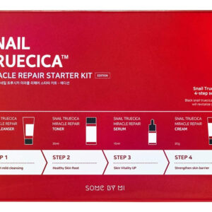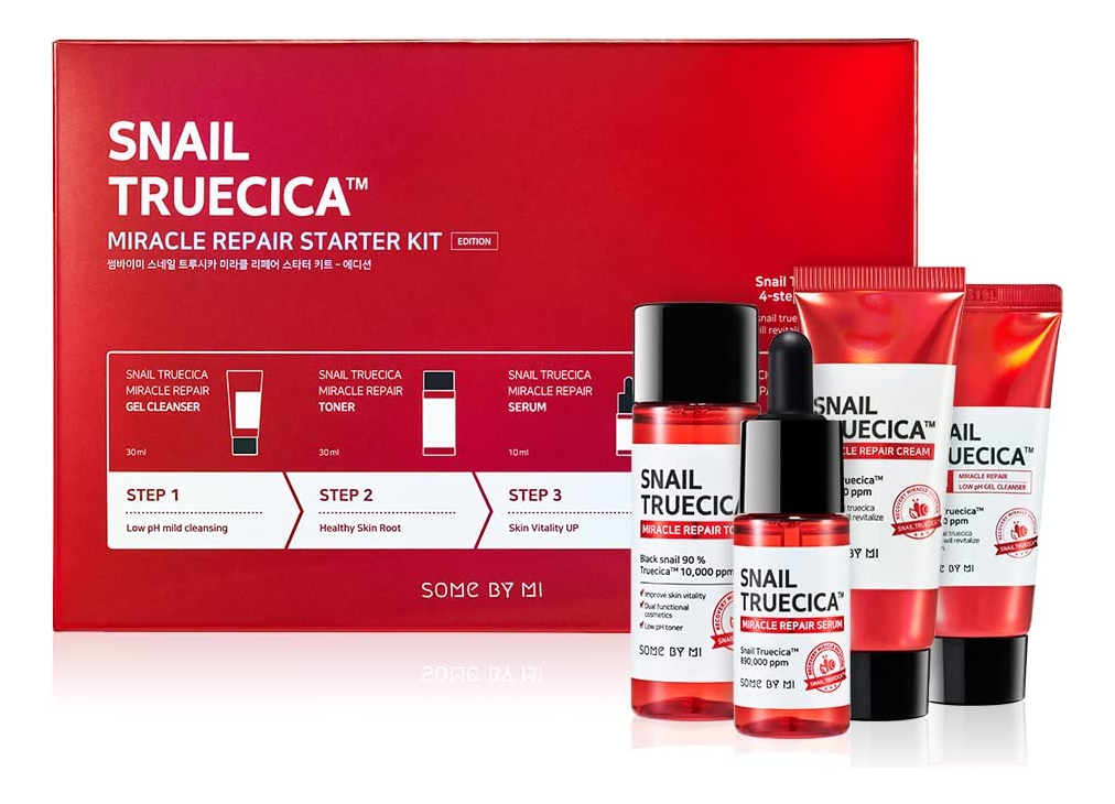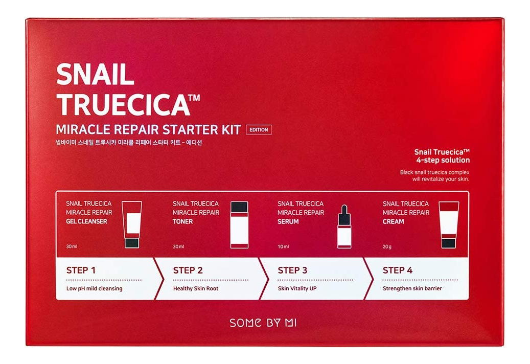 Kit inicial SOME BY MI Snail Truecica Miracle Repair — Tônico 1,01 onça, sérum 0,33 onça, gel de limpeza 1,01 onça, creme 0,67 onças — Conjunto diário de cuidados com a pele para fortalecer a barreira cutânea — Cuidado com a pele coreana — Cuidado calmante da pele danificada com Snail Truecica — Melhora firmemente a barreira cutânea danificada — Contém um agente calmante exclusivo Truecica — Acalma a pele sensível causada por estímulos externos — Livre de 20 tipos de ingredientes nocivos e teste de irritação concluído em pele sensível