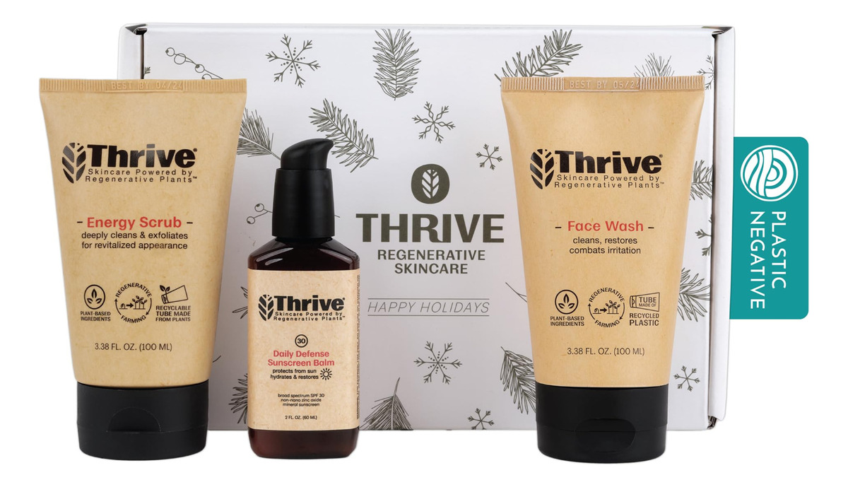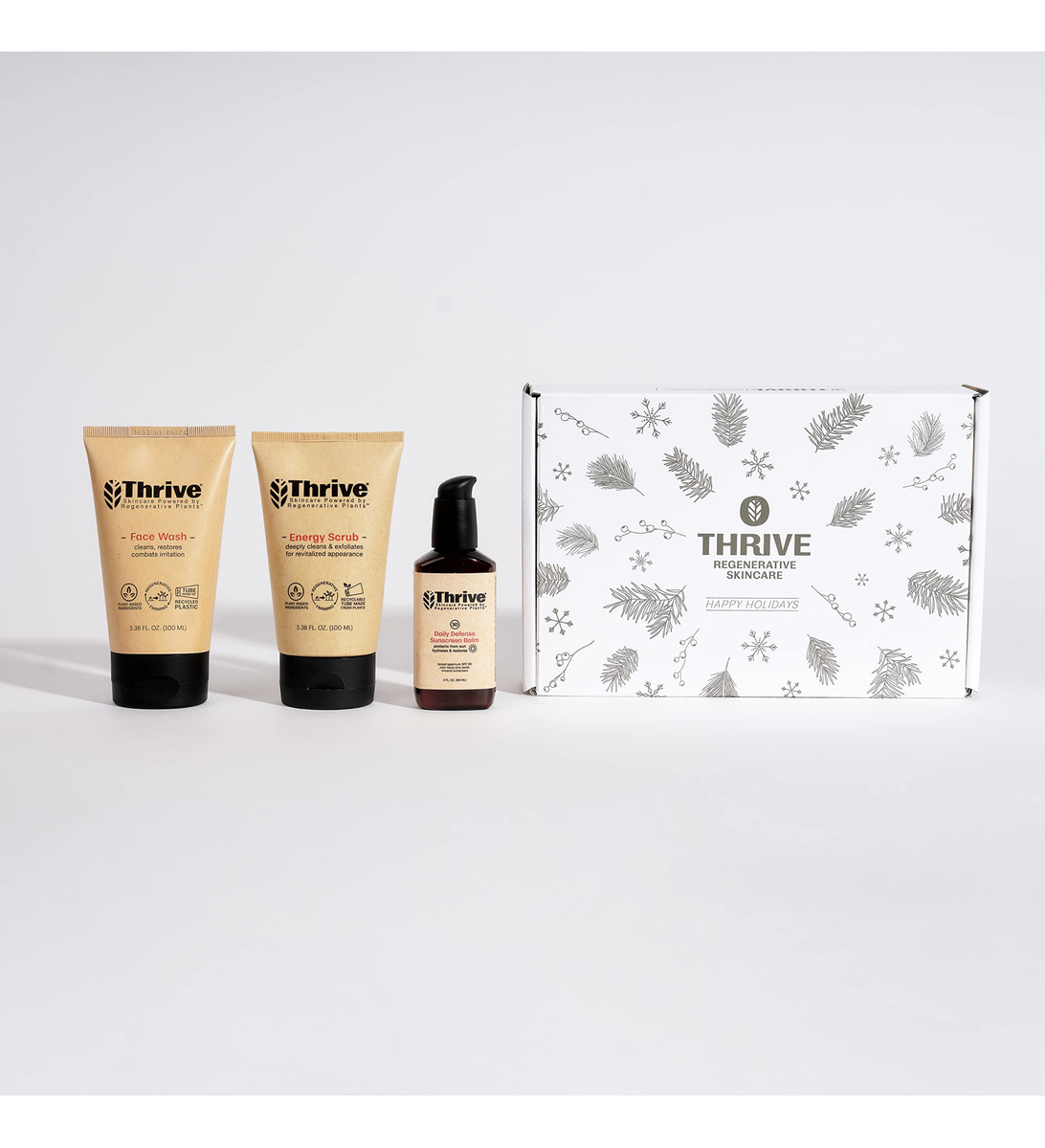 Presente de Natal de cuidados com a pele para homens e mulheres. – Crie uma rotina melhor de cuidados com a pele: trio dos produtos para a pele mais vendidos. O SPF mineral de uso diário para o rosto protege do sol e dos raios UV sem brancura ou oleosidade. O sabonete facial e o esfoliante proporcionam uma limpeza eficaz e suave após suas aventuras urbanas ou selvagens. Alimentado por superplantas exclusivas para manter sua pele com aparência saudável em qualquer lugar. Perfeito para presentear. – O conjunto de presentes Skincare Getaway: inclui esfoliante Thrive Energy em tamanho real, sabonete facial e SPF30 embalados em uma elegante caixa de Natal de edição limitada. – Por que é melhor: fórmulas limpas, clinicamente comprovadas e à base de plantas. Os ingredientes vegetais regenerativos exclusivos do Thrive têm 10 a 12 vezes mais poder antioxidante do que a vitamina E ou C. – Ingredientes cultivados regenerativamente: a agricultura regenerativa aumenta a potência e a pureza dos ingredientes. O resultado é que ingredientes regenerativos tornam os cuidados com a pele mais eficazes do que se os mesmos ingredientes fossem cultivados convencionalmente. – Deixe tudo melhor: cada compra ajuda a apoiar os agricultores rurais que produziram nossas superplantas por meio da agricultura regenerativa. Se você não gosta do seu Thrive, avise-nos e nós forneceremos um reembolso total.