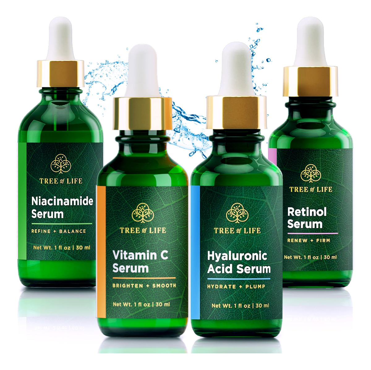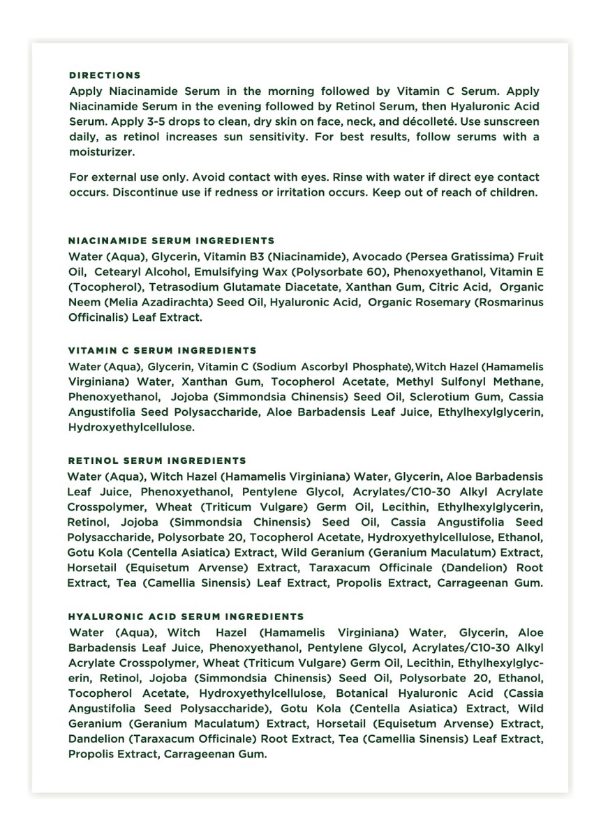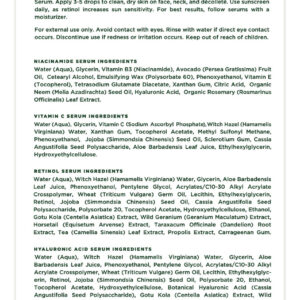 B0BQ3PRDF6 – REGIME DEFINITIVO DE CUIDADOS COM A PELE TUDO-EM-UM: Um conjunto meticulosamente selecionado de quatro dos melhores séruns, cada um guardião da vitalidade da sua pele. Refine sua pele reduzindo os poros e reforçando as defesas contra o ataque invisível dos estressores ambientais diários, atenua as manchas escuras e revele uma tela mais lisa e firme em sua pele hidratada. Simplifique sua rotina enquanto eleva sua pele ao auge da beleza natural. – COMO FUNCIONA: O sérum de niacinamida ajuda a minimizar os poros, clarear a pele e melhorar seu tom geral. O sérum de ácido hialurônico ajuda a hidratar, suavizar e dar volume. O Sérum Retinol reduz a aparência de linhas finas e rugas e desbota a aparência das manchas da idade. A vitamina C ajuda a clarear e suavizar a pele. – INSTRUÇÕES FÁCEIS DE USAR: Aplique o sérum de niacinamida pela manhã seguido pelo sérum de vitamina C. Aplique o soro de niacinamida à noite, seguido pelo soro de retinol e, em seguida, soro de ácido hialurônico. Aplique 3-5 gotas na pele limpa e seca do rosto, pescoço e pinça. Use protetor solar diariamente, pois o retinol aumenta a sensibilidade ao sol. Para obter melhores resultados, aplique um hidratante — ADEQUADO PARA PELE SECA E SENSÍVEL: Nossos séruns são leves, hipoalergênicos e livres de produtos químicos agressivos que podem causar irritação ou ressecamento. Eles oferecem a hidratação necessária, alívio calmante, cuidado abrangente e suavidade para peles secas e sensíveis. Testados por dermatologistas e livres de crueldade: repletos de ingredientes cuidadosamente escolhidos com os quais você pode se sentir bem! O compromisso da Tree of Life com a saúde da sua pele é apoiado por rigorosos testes dermatológicos, garantindo cuidados de alta qualidade e mantendo firmemente os padrões livres de crueldade. – Os ingredientes ativos nos cuidados com a pele às vezes podem ter um cheiro distinto que algumas pessoas podem achar desagradável. Embora outras marcas possam adicionar fragrâncias artificiais para mascarar o cheiro, elas podem causar irritação. O cheiro significa que nossos soros estão funcionando enquanto permanecem amigáveis à pele sensível.