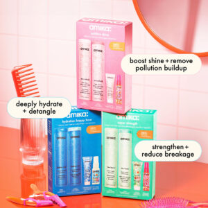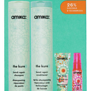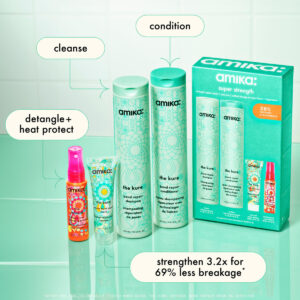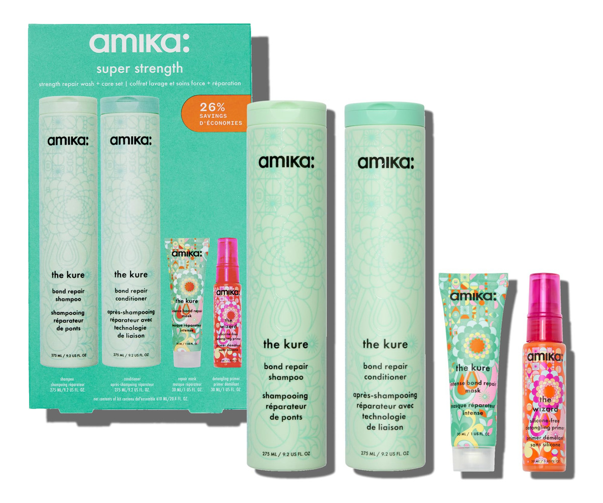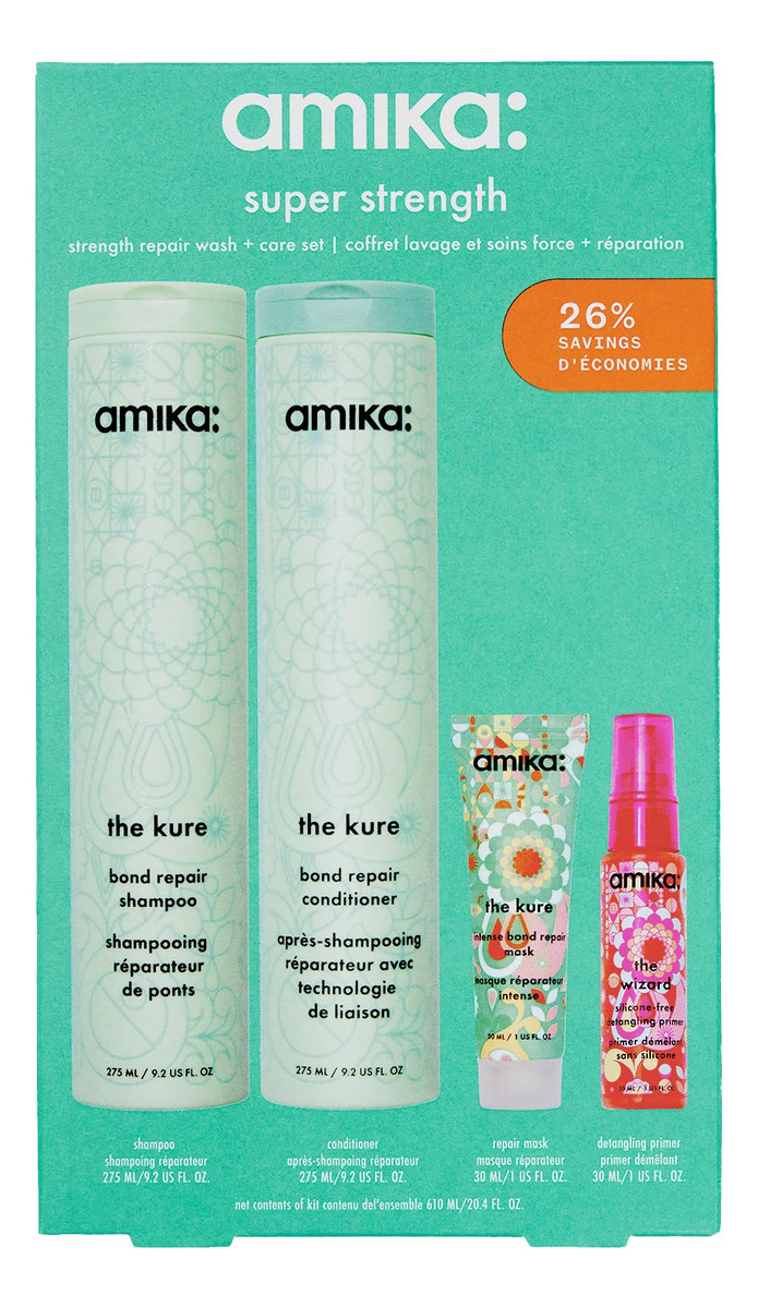 amika super strength repair wash + care set – o shampoo kure strength repair: um shampoo fortalecedor que limpa suavemente e resulta em 55% menos quebra* + 2 vezes mais forte* cabelos após um uso. *testado clinicamente, em comparação com o controle quando shampoo e condicionador são usados como um sistema. – o condicionador kure bond repair: um condicionador hidratante que resulta em 55% menos quebra* + 2x mais fortes* cabelos após um uso. *testada clinicamente, em comparação com o controle quando shampoo e condicionador são usados como um sistema. – a máscara kure intense bond repair: uma máscara reparadora ultra-rica que, clinicamente, resulta em cabelos 3,2 vezes mais fortes, ** 8 vezes mais condicionados, ** com 69% menos quebra**. **testado clinicamente, após um uso. – o primer desembaraçante sem silicone Wizard: um primer leve que aumenta o brilho, desembaraça, reduz o frizz e protege o cabelo contra o calor de até 450 pés. Testado clinicamente.