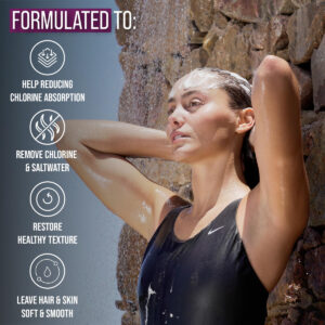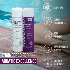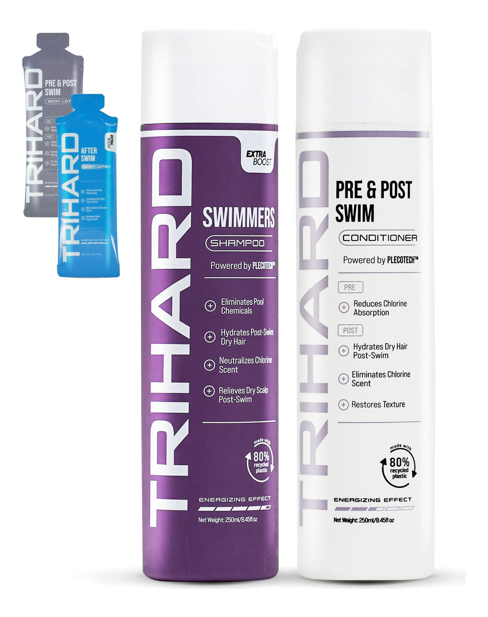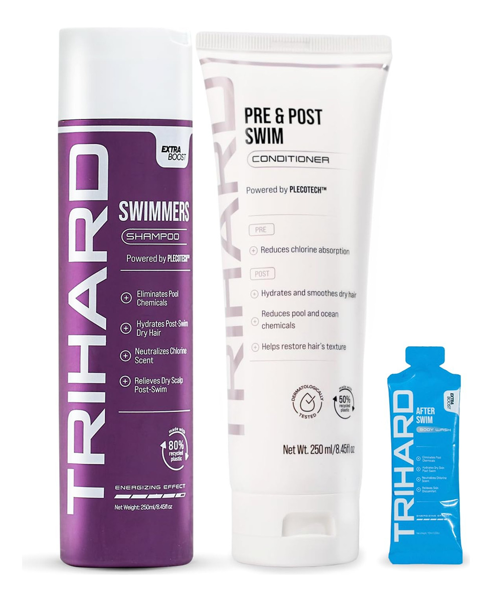 O shampoo TRIHARD Extra Boost e o condicionador Pre & Post Swim manterão seu cabelo livre de cloro e água salgada, ao mesmo tempo em que parecerão saudáveis e macios. Para pessoas que buscam construir cabelos mais fortes e saudáveis, este é o par de cuidados com o cabelo perfeito para você. Os produtos são finamente feitos com minerais do mar morto e extratos botânicos para ajudar a acalmar e reparar os cabelos danificados. Este produto trabalha muito para purificar o cabelo antes e depois da natação. Além disso, o shampoo TRIHARD Extra Boost e o condicionador Pre & Post Swim vêm em um frasco de 10,4 fl oz que o torna um ótimo tamanho portátil para guardar em uma academia ou bolsa noturna para uso em qualquer momento. – O shampoo TRIHARD Extra Boost e o condicionador pré e pós-natação são perfeitos para todos os atletas aquáticos, exercícios diários de natação, exercícios na água ou relaxando na piscina ou na praia. – Produtos para cabelo especializados em natação que são ótimos presentes para nadadores! Nosso produto protege o cabelo antes da natação, hidrata o cabelo seco, elimina os produtos químicos da piscina, neutraliza o cheiro de cloro e alivia o couro cabeludo seco e a textura após a natação. – O shampoo TRIHARD Extra Boost e o condicionador pré e pós-natação são feitos finamente com minerais do mar morto e extratos botânicos, incluindo cloreto de magnésio, sais do mar morto, mentol, aloe vera, manteiga de karité e vitamina e para ajudar a purificar e amaciar o cabelo. – Todos nossos produtos são limpos e confiáveis; sem SLS, sem parabenos, sem álcool, sem transgênicos e sem crueldade. – O TRIHARD foi projetado, testado e confiável de mais de 300 nadadores, triatletas e atletas de esportes aquáticos que buscam produtos que ajudem a remover o cloro do cabelo antes e depois da natação.