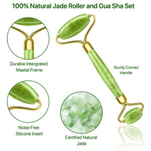 Especificações: Tipo de item: rolo de jade Material: jade Cor: verde Tamanho do item: 5,5 x 2,0 polegadas Peso do item: 2,49 onças Tipo de item: Jade Guasha Material: jade Cor: verde Tamanho do item: 3,2 * 2 polegadas Peso do item: 1,51 onças de material de jade natural, cada conjunto de rolo de jade e gua sha é polido à mão. Conjunto de rolo facial e gua sha, embalagem de presente requintada, presente exclusivo para você, mãe, amigos e amante Lista de pacotes: 1 * Jade Roller 1 * Jade Guasha – Cuidados com a pele: usar um rolo facial e um conjunto de gua sha para cuidar da pele ajuda a reduzir o inchaço, rejuvenescer a pele e promover uma aparência firme e úmida. – Rolo facial: o rolo facial Eyglajdd para cuidados com a pele oferece uma aparência suave e resistente. experiência de rolamento sem nenhum ruído. Uma sensação refrescante e refrescante que energiza a pele. – Gua Sha: o massageador facial foi projetado especificamente para realçar sua beleza. O formato exclusivo do Gua sha contorna perfeitamente a linha do rosto, permitindo que ele atinja e melhore com eficácia as linhas finas e rugas. – Fácil de limpar: feita de pedra natural de jade com textura e cor naturais exclusivas, esta ferramenta gua sha com rolo de jade é fácil de limpar. Basta usar um pano úmido para limpá-lo. – Pacote de presente: o conjunto inclui 1 rolo de jade e 1 pedra gua sha, lindamente embalados em uma caixa de presente. É um maravilhoso conjunto de presentes de cuidados com a pele para mães, mulheres, esposas ou amigas. Perfeito para aniversários e Natal.