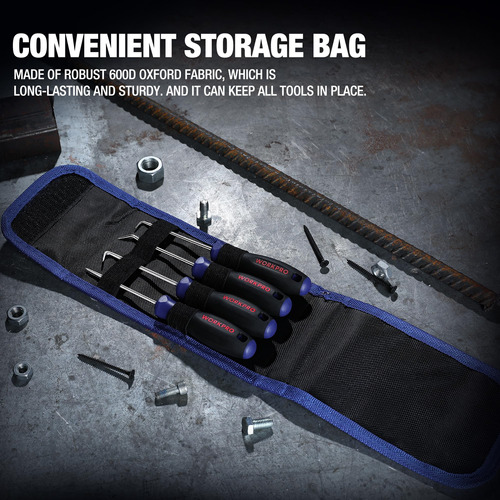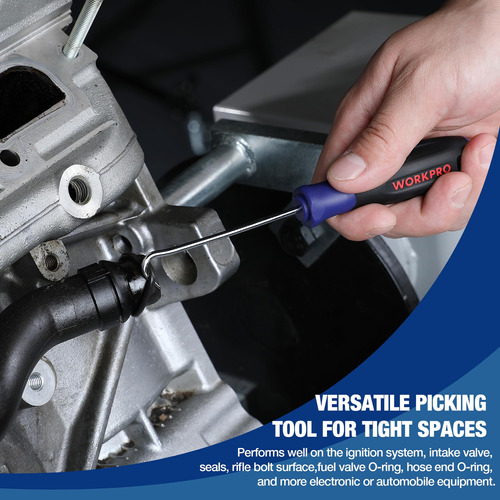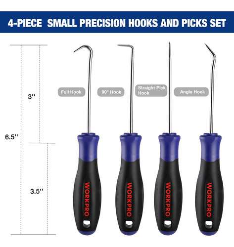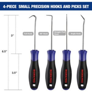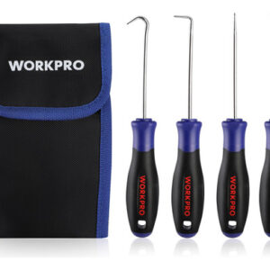O conjunto Heavy Duty Hook and Pick tem 4 formas para puxar clipes, anéis, fios, juntas, arruelas e outras peças pequenas. A lâmina se estende por toda a alça e é totalmente tratada termicamente. A alça composta foi projetada para proporcionar conforto e reduzir a fadiga manual e a alça patenteada permite que o usuário bata na ponta sem danificar a alça – MATERIAL DE QUALIDADE PREMIUM – O conjunto de palhetas de precisão é extremamente sólido e durável, construído em aço carbono tratado termicamente para melhorar o desempenho e a eficiência do trabalho. As palhetas de ferramentas pontiagudas multiuso 4 em 1 têm uma superfície cromada, que pode prevenir eficazmente a corrosão e a ferrugem. – Conjunto de ferramentas com gancho e picareta de 4 peças – Este conjunto de ferramentas com gancho de precisão inclui 1 gancho reto, 1 gancho completo, 90 ganchos, 1 gancho angular. 4 formas são perfeitas para uma variedade de tarefas necessárias em oficinas ou garagens, especialmente para uso em espaços de difícil acesso. Este é um ótimo presente mecânico para homens e entusiastas da mecânica. – AMPLAMENTE UTILIZADO – Nossa ferramenta de extração de mangueiras é ótima para montar, reparar ou desmontar peças pequenas, especialmente em sistemas de ignição, válvulas de admissão, superfícies de parafusos de rifle, substituindo anéis de vedação de válvulas de combustível, anéis de vedação, contrapinos e molas. – Aderência ergonômica – Este conjunto de palhetas automotivas possui uma estrutura de alça ergonômica e uma camada macia de TPR de duas cores para maior conforto, que ajuda a aliviar a fadiga das mãos e garante controle de precisão durante o uso prolongado. – BOLSA DE FERRAMENTAS PORTÁTIL – WORKPRO O kit de coleta mecânica vem embalado em uma bolsa de ferramentas de armazenamento que é durável o suficiente para manter todas as ferramentas de coleta no lugar. É de fácil acesso e ocupa pouco espaço. Dimensões: 17,3 x 4,3.