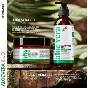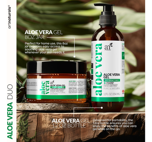 “Do jardim ao seu rosto, quem diria que uma planta suculenta simples era tão cheia de tantos benefícios? Nosso suave gel de Aloe Vera deve ser usado no banheiro e na bolsa de dia. Rico em antioxidantes, minerais e outros nutrientes, seus muitos benefícios têm sido utilizados há séculos. Agora é a sua vez! O gel de Aloe Vera artnaturals é orgânico e de qualidade artesanal. O que você obtém é o alívio calmante e curativo que o verdadeiro gel orgânico de aloe vera proporciona para queimaduras solares, queimaduras pelo vento e erupções cutâneas. – Pacote duplo definitivo para cuidados abrangentes: nosso conjunto de gel de aloe vera inclui um frasco de 12 onças com uma bomba conveniente para uso diário sem esforço, além de um frasco de 8 onças perfeito para aplicações ou viagens mais específicas. Se você está reabastecendo sua pele em casa ou em qualquer lugar, este pacote duplo oferece a versatilidade e a conveniência de que você precisa para manter sua pele nutrida e hidratada. – Aloe fresco na fazenda para máxima potência: temos orgulho do frescor do nosso gel de aloe vera, que é colhido e preenchido em apenas 12 horas. Esse processo rápido do cultivo até o enchimento garante que o aloe vera retenha suas enzimas, vitaminas e minerais naturais, proporcionando potência e eficácia incomparáveis diretamente à pele. Experimente a diferença que o aloe vera verdadeiramente fresco pode fazer em sua rotina de cuidados com a pele. – Feito com 99% de aloe vera orgânico: nosso gel de aloe vera é feito de aloe vera orgânico 99% puro, garantindo que você trate sua pele apenas com o melhor que a natureza tem a oferecer. Livre de produtos químicos agressivos, cores artificiais e conservantes, este gel oferece uma solução suave e poderosa para quem busca cuidados naturais com a pele. É a escolha ideal para quem deseja adotar um regime de beleza mais limpo e ecológico. – Essencial para um regime de beleza radiante: eleve sua rotina de cuidados com a pele com nosso gel de aloe vera, essencial para manter uma pele saudável e brilhante. Perfeito para uso diário, hidrata profundamente, acalma a vermelhidão e ajuda a reduzir a aparência de manchas e linhas finas. Seja usado como hidratante, base de maquiagem ou máscara calmante, este gel é ideal para obter e manter uma tez radiante. – Alívio refrescante e calmante para irritações cutâneas: nosso gel de aloe vera é seu aliado natural para alívio da dor e recuperação da pele. Infundido com as propriedades refrescantes do aloe, ele fornece alívio instantâneo de queimaduras solares, pequenas queimaduras e irritações na pele. A fórmula calmante acalma a coceira e o desconforto, tornando-a uma adição essencial ao seu kit de primeiros socorros. Desfrute da tranquilidade de saber que você tem um remédio natural e confiável para as pequenas emergências cutâneas da vida.