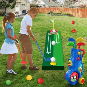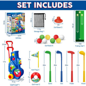 Kids Golf Club Set – Toddler Golf Ball Game Play Set Sports Outdoor Toys Birthday Gifts for Boys Girls 3 4 5 6 Year Old (Blue) – UPGRADED TODDLER GOLF SET FOR 3-5Letapapa kids golf set comes with 1 golf cart, 4 golf clubs ( sand/iron/putter/wood), 1 storage bag, 8 larger balls (1.8 inches and avoid choking hazards), 2 holes with flags, 2 bases, 1 putting mat. 2023 upgraded toy golf set is a great choice for your little kids to develop the interesting of golf. – UNIQUE DESIGN & WELL-MADELetapapa toddler golf cart with a retractable handle (about 17-24) and flexible wheels, let kids could pull easily. 4 different double-sided use clubs are based on the professional golf design and meet the left-handed needs. Golf balls and holes can put in the included storage bag for easily access when playing. In addition, it has a unique shoulder strap to make kids easily carry the whole set anywhere. – SAFETY FIRST& DURABLEWe always prioritize high-quality standards for our golf club toy set, which are produced with non-toxic and high-quality ABS materials, BPA-free and durable enough. The connection of clubs have increased the hardness and length, will avoid broken under normal use. The smooth edge can protect your kids from hurt. – ENJOY REAL GOLF GAME NOWOur golf set is perfect to be the first golf toy for toddlers! The exclusive customize length and size are larger than others, suitable for kids 3-6. Beginners will learn more about golf through Letapapa complete golf set. Parents can also PK with your little one, come and join the golf game now. It will improve kids motor skills, hand-eye coordination and cultivate good exercise habits from an early age. – IDEAL GIFT FOR BOYSLetapapa baby golf set is the perfect indoor/outdoor sports gift for boys 3+ in birthday, Childrens Day, Christmas etc. We believe in providing excellent customer service and ensuring a positive shopping experience for all our customers. If you have any questions regarding our animal toys, please feel free to contact us. We will try our best to serve you anytime.