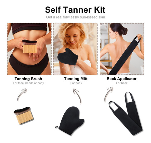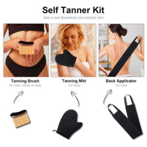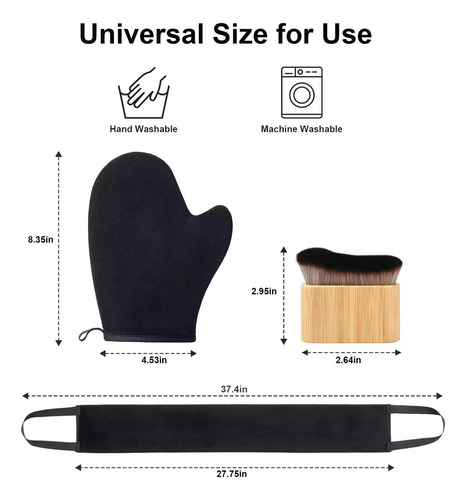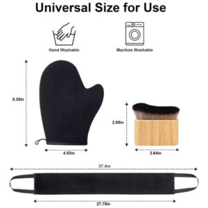 Conjunto de luvas autobronzeadoras 3 em 1 Nossas luvas autobronzeadoras vêm com 1 aplicador de luva autobronzeadora preta, 1 aplicador autobronzeador preto e 1 escova corporal autobronzeadora, tornando-as mais econômicas do que comprar uma luva autobronzeadora preta autobronzeador separadamente. As luvas de bronzeamento podem ser usadas em várias partes do corpo, enquanto a escova autobronzeadora é para áreas detalhadas (como rosto e mãos), e o aplicador autobronzeador traseiro facilita o acesso a áreas de difícil acesso.