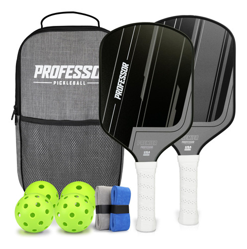 Conjunto de pás Professor Premier Pickleball de 2 pás de superfície de fibra de vidro, 4 bolas, bolsa de transporte e alças – aprovado pela USAPA em 2024! – 2 pás aprovadas pela USAPA: as pás Professor Premier são exaustivamente testadas e aprovadas oficialmente para torneios profissionais e jogos completos em todo o mundo. – Pás e equipamentos de pickleball de qualidade premium: as 2 pás Premier foram projetadas para serem uma raquete de sensação premium. Usando uma superfície durável de fibra de vidro para fornecer energia, um núcleo em forma de favo de mel de polipropileno que reduz as vibrações e oferece o controle máximo de suas fotos. Você notará golpes muito melhores com esta raquete do que com outras. Os materiais usados na bolsa, 4 bolas e 2 alças são de primeira qualidade e de qualidade profissional! – MAIOR ADERÊNCIA ERGONÔMICA PARA MAIOR CONFORTO: A alça de 5,5 polegadas oferece mais alcance, uma sensação estável, confortável e premium. A alça perfurada absorvente de suor é acolchoada para a melhor experiência de jogo. A espessura de 4,25 polegadas dá a sensação perfeita para todos os tamanhos de mão, para homens e mulheres. – Design profissional de remo: o formato aerodinâmico da raquete é amplamente utilizado pela maioria dos jogadores profissionais de pickleball, oferecendo o equilíbrio perfeito entre leveza e um grande ponto ideal para as melhores fotos possíveis. O formato foi projetado para mover suas mãos mais rapidamente na rede, ganhando mais pontos. 7,7 a 8,0 onças é o peso ideal para os melhores jogadores. – CONJUNTO COMPLETO DE PICKLEBALL INCLUÍDO: 2 pás de pickleball Premier, 2 bolas internas, 2 bolas externas, bolsa de transporte de alta qualidade e 2 alças secas em azul e cinza para personalizar sua aparência. Tudo o que você precisa para entrar nas quadras e começar a jogar hoje com seus amigos! Um conjunto de pickleball perfeito para iniciantes e jogadores profissionais!