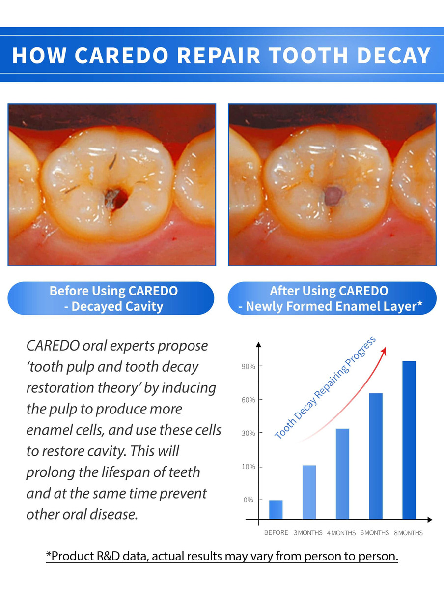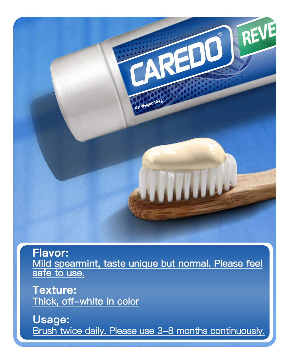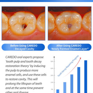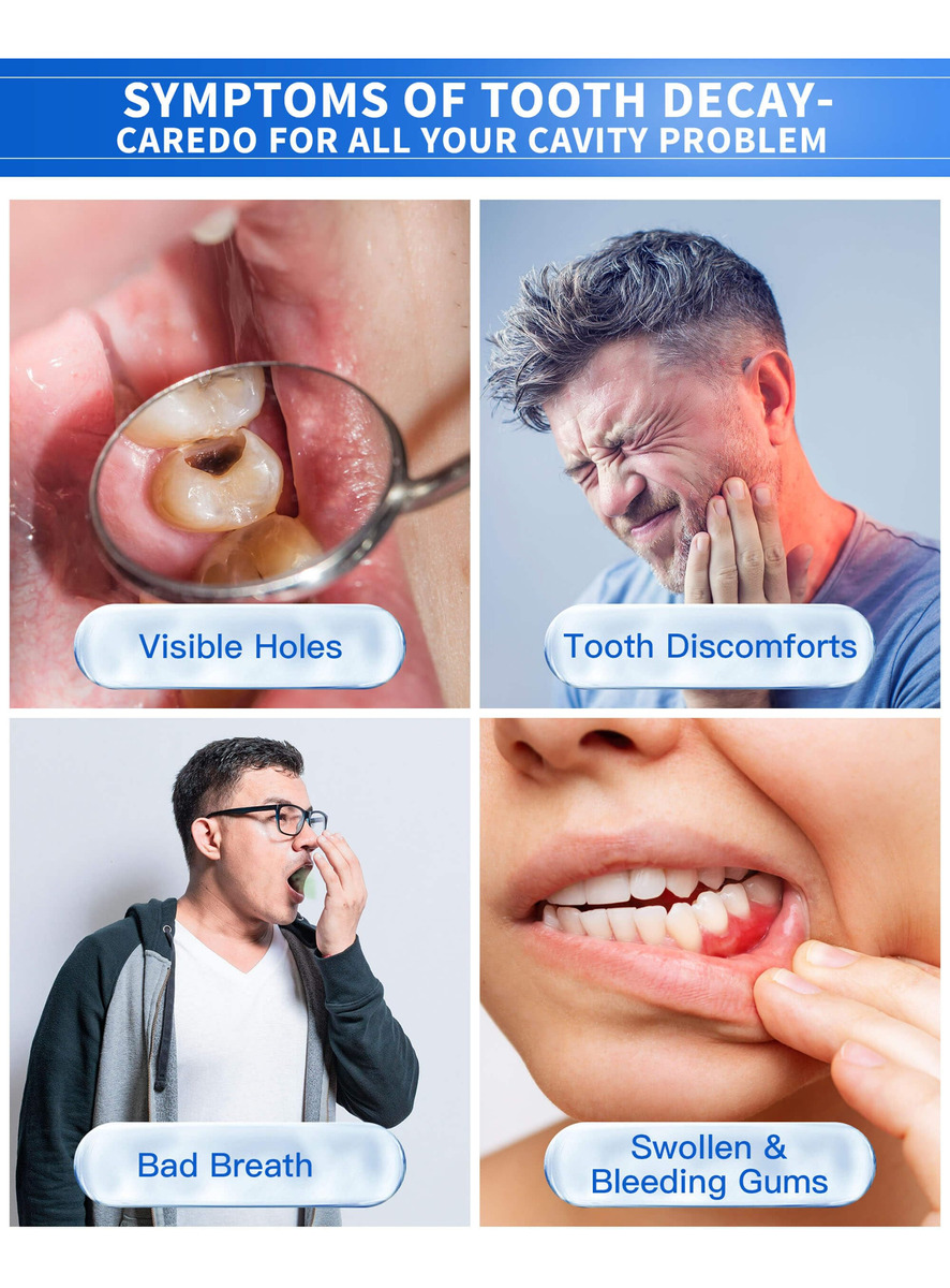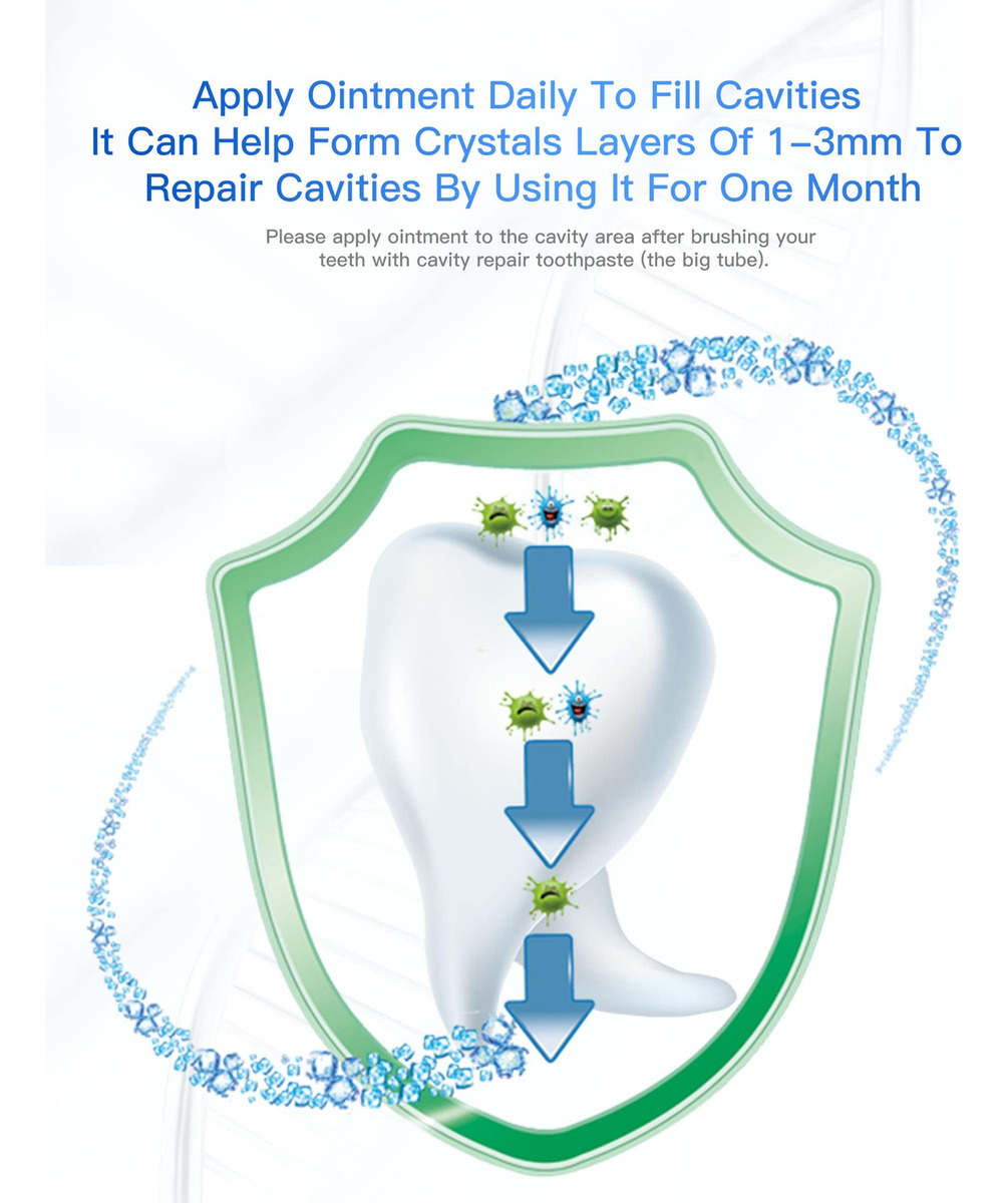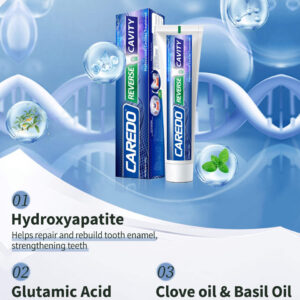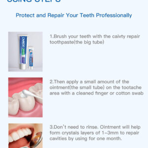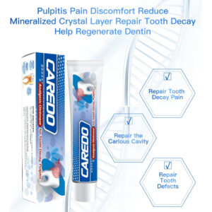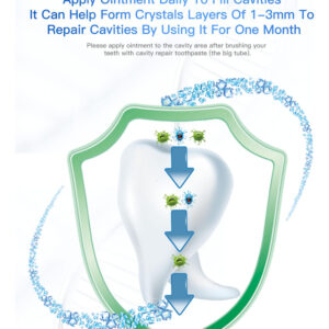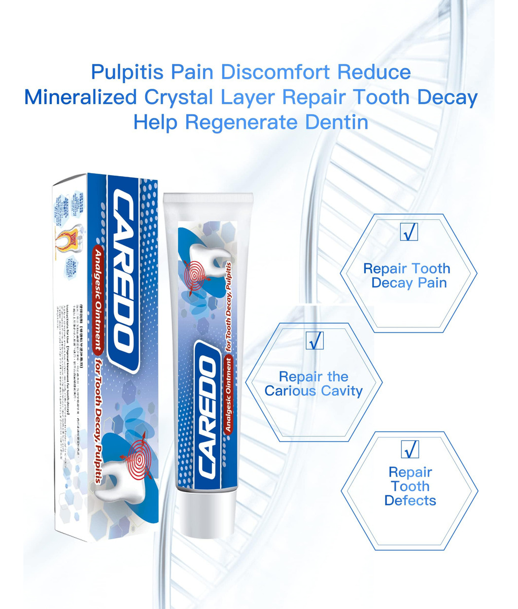 Design de creme dental CAREDO Repair como alívio da dor de dente para adultos e pomada analgésica de tubo pequeno para pulpite por cárie dentária, sem necessidade de ir ao dentista! Alívio da dor para cárie dentária e pulpite, analgésico, antiinflamatório, reparação e preenchimento da cárie dentária, reparo de defeitos dentários Como usar: 1. Pomada analgésica espalhada na cavidade da cárie dentária, os cristais preencheriam lentamente a cavidade da cárie dentária 2. Use um cotonete ou uma mão limpa para aplicar a pomada analgésica na cavidade e ao redor dela 3. Não é necessário enxaguar com água, os ingredientes ativos do analgésico A pomada mineralizará automaticamente nas cavidades, formando cristais para preencher as cavidades, e os cristais podem crescer 1-2 mm por mês com o uso a longo prazo Após usar o creme dental CAREDO Repairing Dental Caries 3 a 8 meses: 1. Remova a placa dentária na superfície dos dentes 2. Esmalte desmineralizante desmineralizante 3. Os túbulos de dentina na superfície erodida são preenchidos com partículas da pasta de dente e isso forma uma camada cristalizada dura, eliminando a sensibilidade à dor 4. A nova camada restauradora de esmalte cristalizado substitui a dentina deteriorada e amolecida. Isso acaba com a dor causada pela cárie dentária e pela mastigação. 5. A camada amolecida que é corroída pela placa dentária é substituída por uma camada de esmalte cristalizado com alguns milímetros de espessura. Isso protege a polpa e evita a pulpite. Nota 1 Durante o uso de creme dental, não use cárie para mastigar alimentos. O cristal recém-formado é relativamente fino e não suporta a pressão de mastigar alimentos. 2. Crianças com 12 anos ou menos não são aconselhadas a usar este produto. Para cremes dentais com funções semelhantes, considere a CAREDO Repairing Dental Caries for Kids. – 1. Conjuntos de cremes dentais para reparo de cáries caseiras – Recomendados por especialistas orais para o tratamento da cárie dentária em adultos. Especialmente para desconfortos de cárie dentária e pulpite. O pacote inclui 1 tubo de 100g de creme dental reparador e 1 tubo de 16g de pomada de pulpite CAREDO. A pomada analgésica tem um cheiro especial para reparar os desconfortos dentários em decomposição. É normal e sinta-se seguro de usar. – 2. Pasta de dente com hidroxiapatita Pasta de dente para reparo de cavidades Esta pasta de dente Caredo é o ÚNICO produto para reparar a cárie dentária para reversão da cavidade. Você nunca precisará se preocupar com a recaída após usá-la, pasta de dente reparadora de esmalte para uso doméstico. – 3. Pomada para desconfortos da pulpite Caredo – Suprime rapidamente a cárie dentária e interrompe a erosão na dentina. Alivia o desconforto da cárie dentária e da pulpite. Engrosse e remineralize a dentina na parte inferior da área cariada, ajudando a proteger a polpa. O uso prolongado do creme dental reverso Cavity de tubo grande pode reparar a cárie dentária, o que pode ajudar a criar camadas de cristal para preencher a cavidade de 1 a 3 mm por mês. – 4. Conjunto de creme dental remineralizante para cárie dentária – Recuperação da cárie dentária dentro de 3 a 8 meses após o uso de creme dental reparador de cáries e pomada para pulpite. Você pode reduzir a verificação odontológica porque seu problema de cárie dentária será resolvido se você usar o creme dental CAREDO configurado corretamente todos os dias. – 5. Como usar? – A pomada para pulpite deve ser usada com creme dental de hidroxiapatita para reparação de cáries em conjunto. Depois de escovar os dentes com creme dental de hidroxiapatita reparadora de cáries, aplique imediatamente o pequeno tubo de pomada de pulpite na área afetada. Você não precisa enxaguar a boca imediatamente após usar a pomada. 2-3 vezes ao dia até que o desconforto da cárie dentária desapareça.