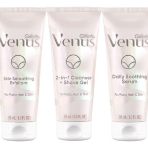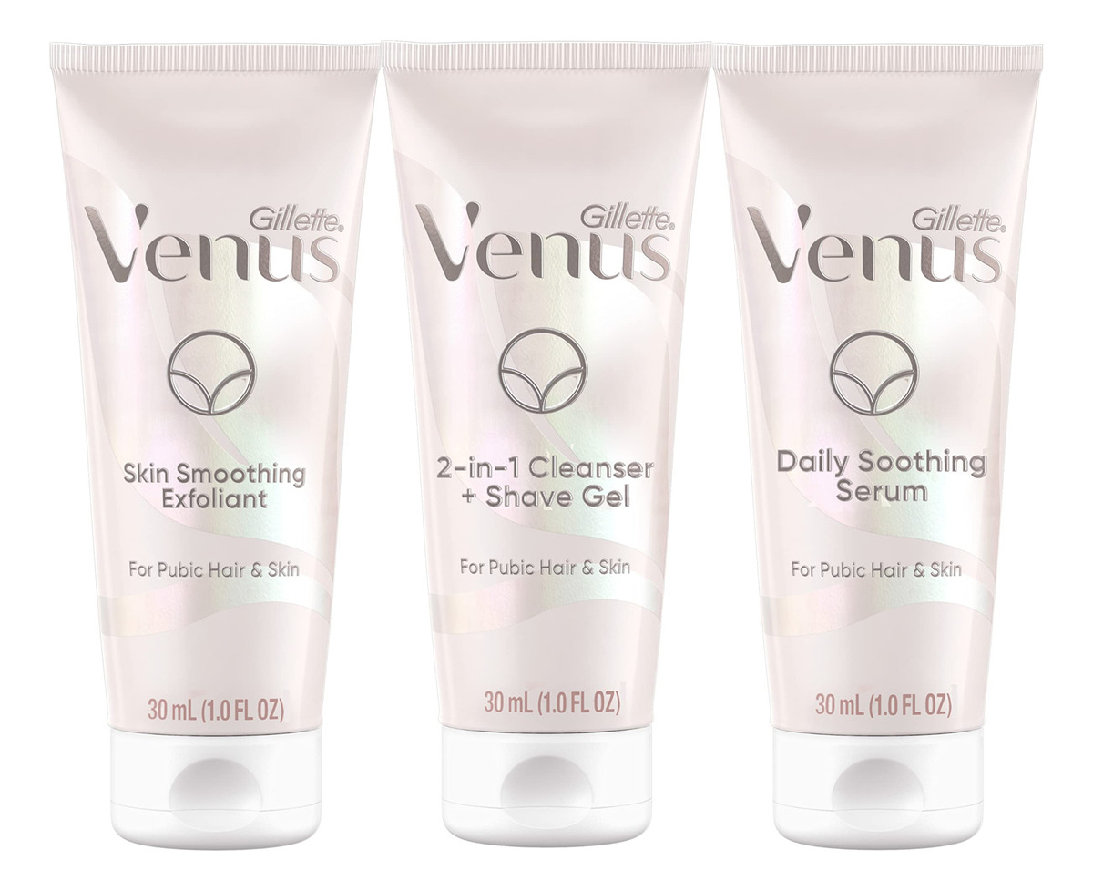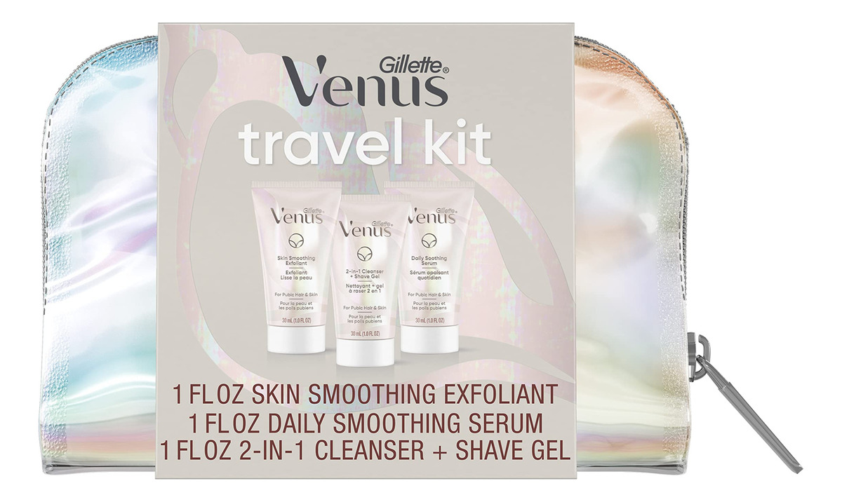 O conjunto de presentes de viagem Gillette Venus para pelos pubianos e pele inclui 1 onça de esfoliante suavizante, limpador 2 em 1, sérum calmante e bolsa de viagem — INCLUI: esfoliante suavizante de 1 onça, limpador 2 em 1 onça, sérum calmante e bolsa de viagem — Testado por dermatologistas e ginecologistas — pH balanceado para pele pubiana — Formulação suave: este sérum hidratante é feito sem parabenos, corantes, fragrâncias ou silicones — Para obter ótimos resultados, use toda a linha Venus for Pubic Hair and Skin para ajudar a preparar, ajudar a proteger os pelos pubianos da irritação do barbear e manter seus pelos e pele pubianos