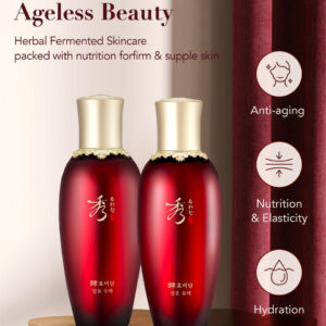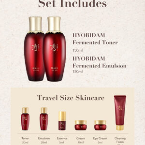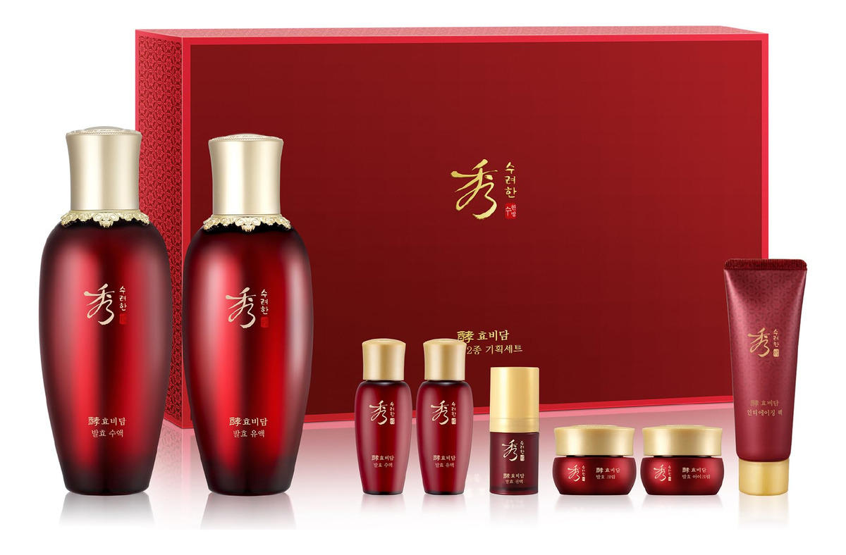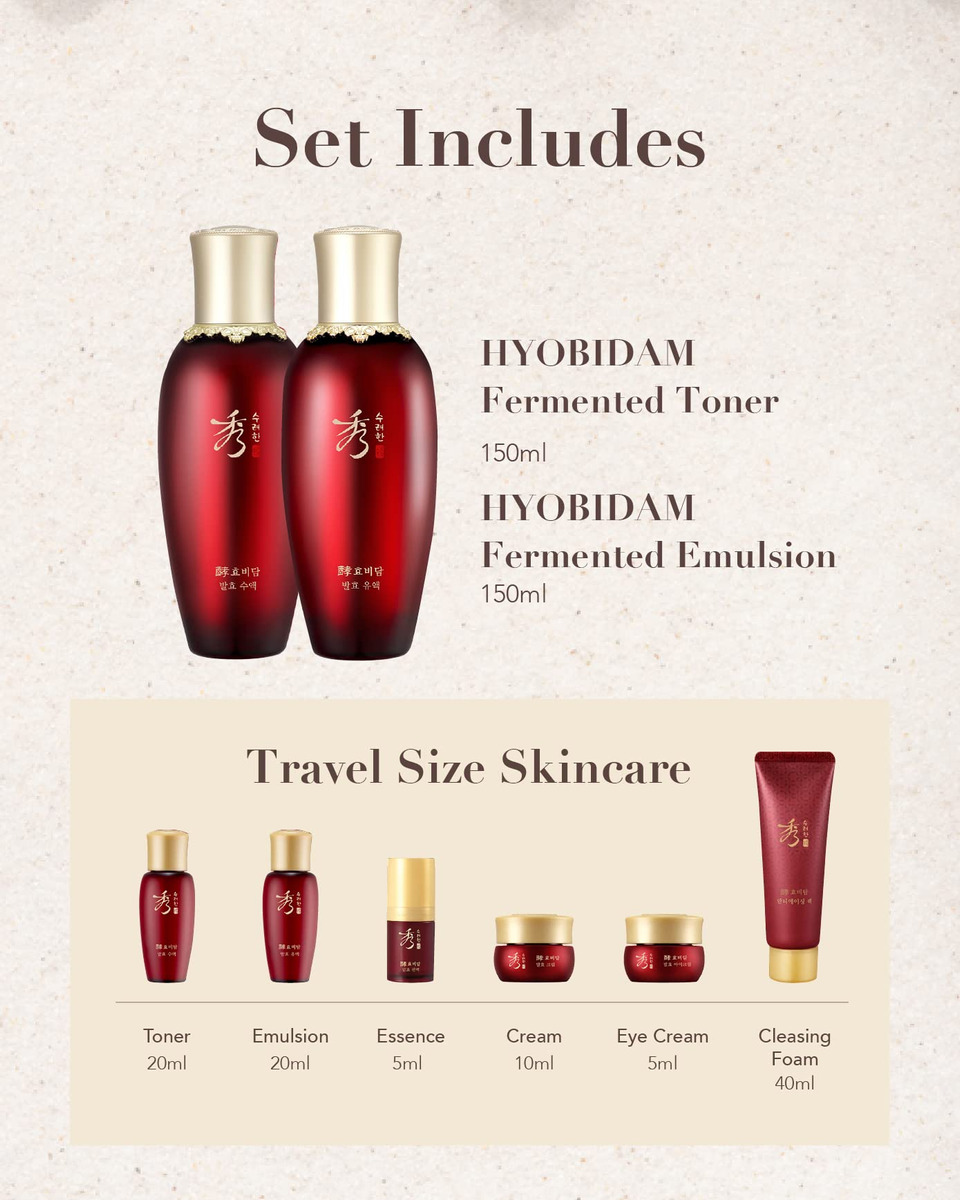 Conjunto de presentes para cuidados com a pele fermentados SOORYEHAN HYOBIDAM — Cuidados com a pele coreanos, tônico revitalizante, loção de emulsão, essência, creme, espuma de limpeza, máscara de lençol — Conjunto de cuidados com a pele fermentado HYOBIDAM — Tônico fermentado HYOBIDAM (5,07 fl oz e 0,67 fl oz), emulsão fermentada (5,07 fl oz e 0,67 fl oz), essência fermentada (0,17 fl oz e 0,67 fl oz) oz), creme fermentado (0,34 fl oz), creme para os olhos fermentado (0,17 fl oz) e pacote para dormir (1,35 fl oz) – OS SEGREDOS DA BELEZA ORIENTAL – Cuidados de pele de luxo Hyobidam Fermented Skincare Collection com o ingrediente chave exclusivo de Baekhyodan, ajudando a pele a diminuir procura linhas finas e fornece hidratação profunda e intensa, resultando em uma pele com aparência mais jovem – A MELHOR HIDRATAÇÃO DE HIGH MOUNTAIN – Uma mistura de ginseng selvagem das áreas não contaminadas do Monte Jiri, que ajuda a pele a combater todos os sinais visíveis de envelhecimento, e extrato de cogumelo prateado fermentado, também conhecido como cogumelo da neve e cogumelo tremella, que tem 400 vezes mais poder de hidratação e partículas menores do que o ácido hialurônico, proporcionando hidratação mais profunda à pele e ajudando a reter essa umidade – SOORYEHAN – Desafiando a idade e a beleza por meio de ervas tradicionais métodos medicinais, usando o ginseng coreano da natureza da Coreia como ingrediente base, aperfeiçoando e extraindo seu potencial de cuidados com a pele por meio da biotecnologia coreana de cosméticos fitoterápicos (Hanbang), Sooryehan é a personificação completa da beleza eterna ao criar produtos para a pele para ajudar sua pele a atingir seu potencial brilhante e eterno – LG BEAUTY – Orgulhosamente parte da LG H&H, oferecendo cuidados com a pele eficazes e produtos para elevar sua vida por meio de ingredientes patenteados e da vanguarda da ciência, tecnologia e experiência da LG