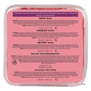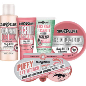 Faça uma turnê com Puffy Eye Attack, Clean on Me, Scrub of Your Life, Face Soap & Clarity e The Righteous Body Butter, todos em tamanhos de viagem. Nosso gel/creme superhidratante é refrescante e repleto de ingredientes que fazem maravilhas como depilador de olhos. Embora diminua a tridimensionalidade da parte inferior dos olhos, este creme funciona de forma semelhante aos tapa-olhos pré-cortados para olheiras. Essa máscara sob os olhos inclui peptídeos botânicos, tecnologia desintoxicante de oxigênio, hiperhidratantes e Cool-Cucumber-X. O hidragel Soap & Glory Puffy Eye Attack é um gênio de ação rápida, desinchante, suaviza a pele e aumenta a hidratação em uma jarra! Este tratamento para olhos inchados inclui peptídeos botânicos de soja e arroz e proteínas de fermento. Os peptídeos vegetais Bionymph energizam e aumentam a umidade da pele. A flor do pagode japonês e o extrato de pepino acalmam os olhos. Use esta máscara para ajudar a reduzir a aparência de olheiras e manchas sob os olhos que persistem.* – A coleção completa de viagens – Embeleze em qualquer lugar com nosso conjunto completo de produtos famosos. Faça uma turnê com Puffy Eye Attack, Clean on Me, Scrub of Your Life, Face Soap & Clarity e The Righteous Body Butter, todos em tamanhos de viagem.* – Lave tudo – Deixe o sabonete líquido Clean On Me limpar você da cabeça aos pés, enquanto o sabonete facial e o sabonete facial Clarity Vitamin C eliminam o acúmulo de poros, para uma limpeza sensacionalmente revigorante.* – Esfoliante e sabonete facial Clarity Vitamin C Hidrate — Deixe nosso esfoliante rosa original da sua vida tratá-lo bem, esfoliando a pele seca e opaca. Continue com nossa manteiga corporal Righteous Body favorita dos fãs para uma hidratação penetrante.* – Attack Under Eye Bags – Soap & Glory Puffy Eye Attack hydragel é uma máscara de gel depurador de olhos de ação rápida, suaviza a pele e melhora a hidratação para dar adeus às olheiras.* – Original Pink Body Care – Pense rosa com nossa linha exclusiva de produtos florais frutados. Enquanto nossos hidratantes corporais se hidratam, aproveite as notas da fragrância de patchouli, almíscar e rosa para encantar os sentidos!