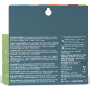 8 sabores — Hortelã, eucalipto, menta, coco, baunilha, frutas cítricas, pêssego, cereja preta e maçã verde