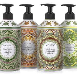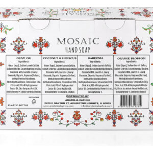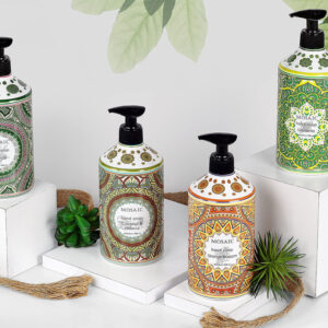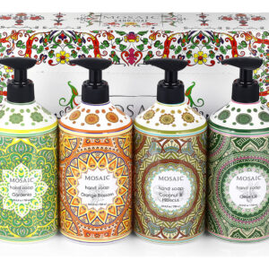 INFUNDIDO COM ÓLEOS NATURAIS Cada perfume é infundido com óleos e extratos de alta qualidade, como azeite de oliva, óleo de coco, extrato de gardênia e extrato de casca de laranja, que deixa as mãos hidratadas com sua espuma densa e rica. SABONETE HIDRATANTE PARA MÃOS Nossos sabonetes para mãos com azeite de oliva, sabonete de coco, sabonete de gardênia e sabonetes de flor de laranjeira para banheiros, cozinhas, banheiros e lavanderias vêm em frascos lindamente projetados com bomba de sabão durável de alta qualidade. SABONETE DE MÃOS PERFUMADO EXQUSITE Cada perfume é formulado para criar um sabonete de mãos premium. Nosso conjunto decorativo de sabonete para mãos doméstico e sabonetes de luxo são ótimos para uso diário em casa ou como um presente comovente para seus entes queridos. RECARGAS GRANDES DE SABONETE PARA AS MÃOS O sabonete para mãos de luxo Mosaic pode ser usado como recargas de sabonete para as mãos, recargas de sabonete líquido, conjunto dispensador de sabonete de cozinha, que também pode ser usado como dispensador de sabonete para as mãos. Nosso conjunto de sabonete para mãos contém quatro (4) aromas individuais, cada um em um grande volume de 24,6 fl oz (730 ml). Não testado em animais. – INFUNDIDO COM ÓLEOS NATURAIS Cada perfume é infundido com óleos e extratos de alta qualidade, como azeite de oliva, óleo de coco, extrato de gardênia e extrato de casca de laranja, que deixa as mãos hidratadas com sua espuma densa e rica. – Sabonete hidratante para mãos Nosso sabonete para mãos com azeite de oliva, sabonete de coco, sabonete para mãos de gardênia e sabonetes para mãos em flor de laranjeira para banheiros, cozinhas, banheiros e lavanderias, vêm em frascos lindamente projetados com alta bomba de sabonete durável de qualidade. – SABONETE DE MÃOS PERFUMADO REQUSITE Cada perfume é formulado para criar um sabonete de mãos premium. Nosso conjunto decorativo de sabonete para mãos doméstico e sabonetes de luxo são ótimos para uso diário em casa ou como um presente comovente para seus entes queridos. – RECARGAS GRANDES DE SABONETE PARA AS MÃOS O sabonete para mãos de luxo Mosaic pode ser usado como recargas de sabonete para mãos, recargas de sabonete líquido, conjunto dispensador de sabonete de cozinha, que também pode ser usado como dispensador de sabonete para mãos. Nosso conjunto de sabonete para mãos contém quatro (4) aromas individuais, cada um em um grande volume de 24,6 fl oz (730 ml) — LIVRE DE CRUELDADE. Não testado em animais.