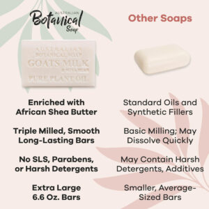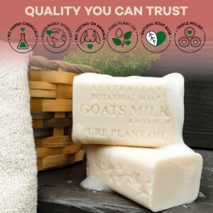 Sabonete de leite de cabra puro e natural para rosto, mãos e corpo Misturado com ingredientes naturais e leite de cabra cremoso das fazendas intocadas do sudeste de Victoria, nosso sabonete de leite de cabra foi projetado para proporcionar a você uma experiência luxuosa. Este sabonete de limpeza suave de leite de cabra e manteiga de karité é enriquecido com óleo de soja e manteiga de karité orgânica. Rico em vitamina E, o sabonete botânico australiano foi desenvolvido para nutrir todos os tipos de pele. Este pacote de 8 sabonetes de leite de cabra é um presente ideal para ela ou ele. Para aqueles que apreciam sabonetes de qualidade, nossos sabonetes de leite de cabra certamente serão apreciados. Ideais como sabonetes para mãos, rosto e banho, esses sabonetes são maravilhosos para guardar no banheiro e na pia da cozinha. Nosso sabonete natural para mulheres e homens oferece uma espuma rica e cremosa. O processo de fabricação com moagem tripla remove toda a água da base do sabonete de leite de cabra, deixando uma barra de sabão densa e duradoura. Este sabonete em barra natural é adequado para rosto, mãos e corpo. Banhe-se com luxo com sabonete puro de leite de cabra. Nossos conjuntos de presentes de leite de cabra para mulheres são um presente encantador, ideal para qualquer ocasião. Este sabonete de cabra feito com leite de cabra é um ótimo sabonete para mãos para o dia a dia que não resseca nem irrita a pele. Nosso sabonete em barra de leite de cabra é infundido com uma fragrância agradável, leve e duradoura. Dê um toque de luxo à sua rotina diária de pele. Características do produto: Tamanho da barra de sabão em barra de leite de cabra – Pacote de 6,8 onças de 8 sabonetes de cabra triplamente moídos com infusão de óleo de soja e manteiga de karité africana orgânica – Sabonete de leite de cabra rico e cremoso: este sabonete em barra de limpeza suave é adequado para pessoas com todos os tipos de pele. Nosso sabonete nutritivo de leite de cabra é rico em vitamina E e infundido com óleo de soja e manteiga de karité africana orgânica. – Sabonetes suaves para mãos, rosto e corpo: o sabonete botânico australiano de leite de cabra não seca e pode ajudar a acalmar a pele irritada. Ótimo para o banheiro de hóspedes, chuveiro e banheira, o sabonete de leite de cabra remove as impurezas enquanto acalma e nutre. – Sabonete de leite de cabra puro e natural: este sabonete triplamente moído não contém sulfatos, ftalatos ou EDTA. Não testamos em animais. Sinta-se bem em se presentear com um sabonete em barra natural de qualidade premium. – Sabonete em barra triplo moído de longa duração: este sabonete de leite de cabra com alto teor de glicerina oferece uma espuma rica e cremosa. O processo de moagem tripla remove a água e cria uma base densa de sabonete de leite de cabra que deixa a pele macia e sedosa. – Luxuoso conjunto de presentes de sabonete de cabra: o sabonete botânico australiano de leite de cabra é muito apreciado por homens e mulheres. Suave e nutritivo, este conjunto de sabonetes é um presente muito especial, ideal para feriados, aniversários ou apenas porque.
