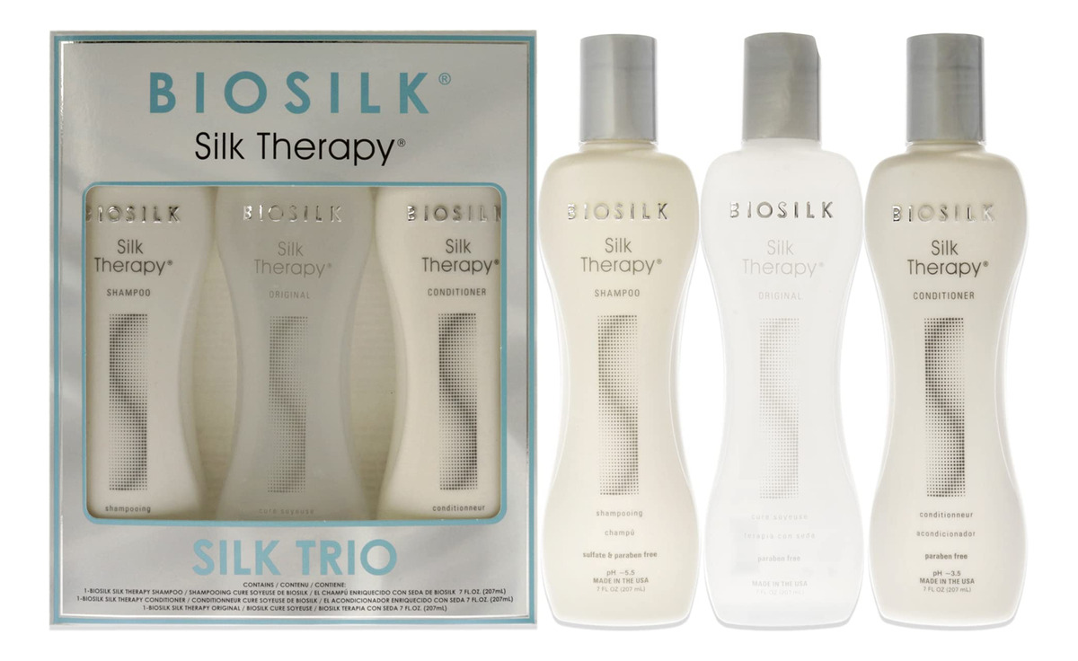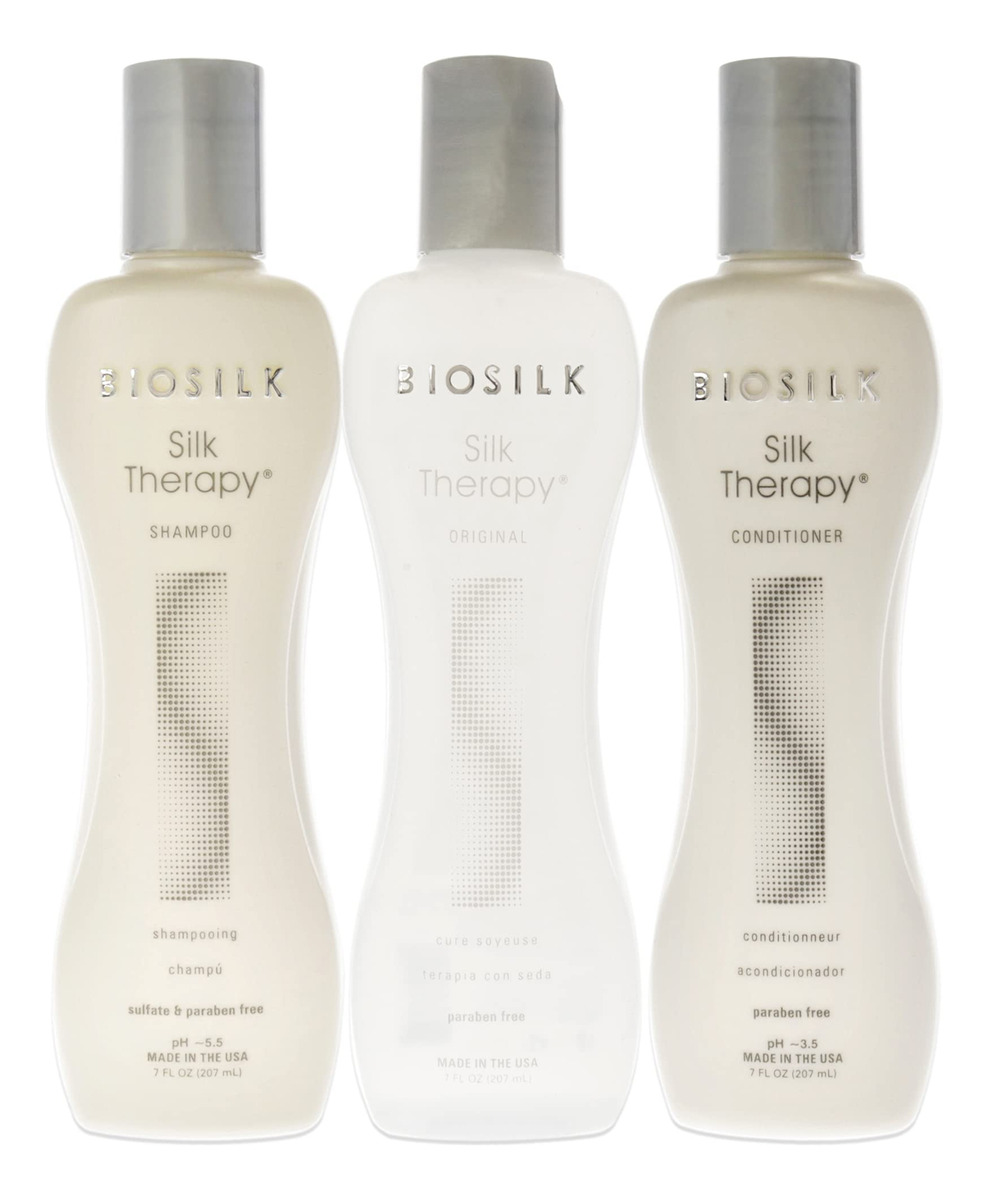 Shampoo de terapia de seda unissex Biosilk Silk Therapy Trio de 7 onças, condicionador Silk Therapy Original de 7 onças e 3 peças – Biosilk silk therapy original é um tratamento leve de reposição e reconstrução de seda que ajuda a reparar, suavizar e proteger todos os tipos de cabelo – Preenche vazios na cutícula para criar cabelos lisos – Auxilia na prevenção de pontas duplas – Oferece brilho incrível – Sem sulfato, sem parabenos e sem glúten.