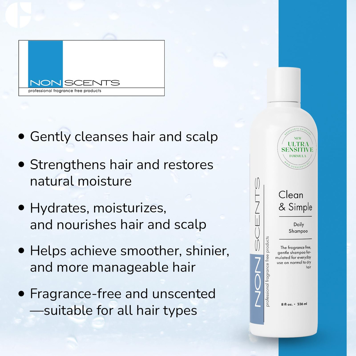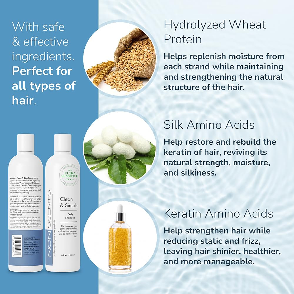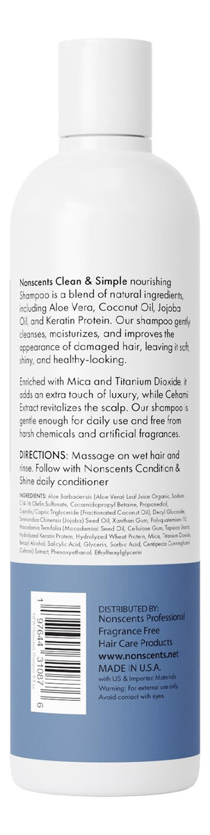 O shampoo e condicionador hidratantes sem perfume é a solução definitiva para o cuidado do cabelo que limpa e condiciona o cabelo e o couro cabeludo de forma suave e completa! Este conjunto de shampoo e condicionador sem fragrância restaura a umidade natural enquanto fortalece o cabelo de dentro para fora, hidrata, hidrata e nutre profundamente o cabelo e o couro cabeludo e ajuda a obter cabelos mais macios, lisos, brilhantes e gerenciáveis. Nosso conjunto de shampoo e condicionador não tem perfume e é hipoalergênico, o que os torna adequados para todos os tipos de cabelo. Entendemos que o cabelo de cada pessoa é único, por isso criamos nossa fórmula com os melhores ingredientes para atender a todos os tipos de cabelo e pele. A proteína hidrolisada do trigo ajuda a repor a umidade de cada fio, mantendo e fortalecendo a estrutura natural do cabelo. Os aminoácidos de queratina ajudam a fortalecer o cabelo enquanto reduzem a estática e o frizz, deixando-o mais brilhante, saudável e mais manejável. Os aminoácidos da seda ajudam a restaurar e reconstruir a queratina do cabelo, revivendo sua força natural. Nosso conjunto de shampoo condicionador é perfeito para quem deseja uma solução suave e eficaz para o cuidado do cabelo. Se você tem cabelos secos, danificados ou normais, nosso xampu e condicionador podem ajudar a devolver a vida e o brilho ao seu cabelo. – Sem adição de fragrância – Nonscents é um conjunto de shampoo e condicionador de qualidade premium sem adição de fragrância. Surfactantes e ingredientes de alta qualidade proporcionam cabelos perfeitamente limpos e sem cheiro. – Seguro para todos os tipos de cabelo – A marca Nonscents é um conjunto hidratante de xampu e condicionador, enriquecido com proteína de trigo, queratina e aminoácidos de seda para dar força e brilho. – Perfect Lather – Um pouco de inodoro ajuda muito – Nosso conjunto de xampu e condicionador sem perfume é muito concentrado, adiciona um pouco de água e cria uma ótima camada mais rápido. – Salon Quality – Os produtos para o cuidado do cabelo sem perfume foram introduzidos por duas mulheres especialistas em cabelo. Muitos outros especialistas testaram e aprovaram nossos produtos e recomendaram para couro cabeludo sensível – Fabricado nos EUA – Nonscents é uma marca com sede nos EUA que produz produtos para o cuidado do cabelo na Califórnia. Todos os produtos têm a garantia de não adicionar fragrâncias, perfumes ou inibidores de perfume.