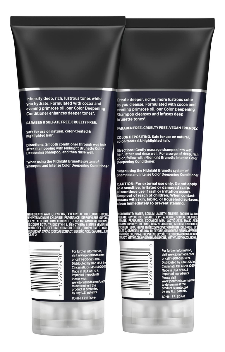 Conjunto de xampu e condicionador John Frieda Midnight Brunette Visibly Deeper com óleo de onagra e cacau para cabelos tingidos (8,3 onças, pacote com 2) – COR MORENA MAIS PROFUNDA – Descubra uma cor morena mais profunda para cabelos naturais ou tratados com nossa combinação exclusiva de ingredientes naturais – cacau natural e óleo de onagra. – NUTRA OS CABELOS SECOS – Deixe seu cabelo lustroso e brilhante mantendo a umidade essencial. – Cacau natural E ÓLEO DE PRÍMULA — Esta mistura de ingredientes foi projetada especificamente para elevar sua cor morena e lhe dar indulgência. tons de cabelo castanho. – CABELOS NATURAIS E COLORIDOS – Quer sua morena seja natural ou tratada, o shampoo e condicionador John Frieda Visibly Deeper ajudarão sua cor a atingir a riqueza que você deseja. – TEXTURA E PESO SAUDÁVEIS – Infundido com ingredientes naturais projetados para adicionar riqueza, textura leve e profundidade ao cabelo, intensificando a cor para todos os tons de moreno.