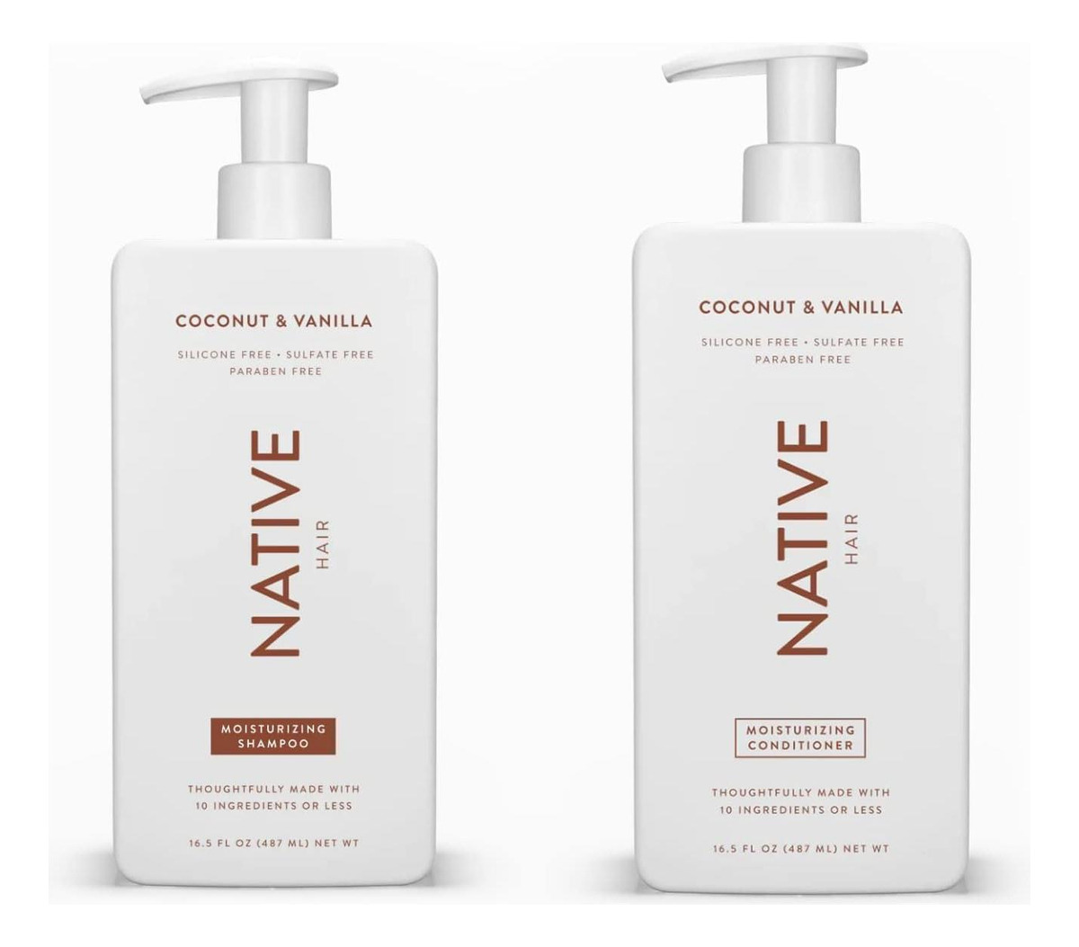 Descubra o poder do Conjunto Shampoo e Condicionador Hidratante Native. Cada frasco contém 16,5 fl oz de pura transformação, limpando suavemente e restaurando a umidade para cabelos macios e saudáveis. Eleve a sua rotina a um ritual de autocuidado revitalizante com esta dupla. Abrace a simplicidade de 10 ingredientes de origem natural, desde produtos de limpeza de óleo de coco até ácido cítrico que equilibra o pH, todos livres de silicone, sulfatos, parabenos e corantes. Nossa fórmula vegana e sem crueldade se adapta a todos os tipos de cabelo, oferecendo compatibilidade e suavidade mesmo para cabelos coloridos ou tratados. Mergulhe na mistura cativante de Coco e Baunilha.