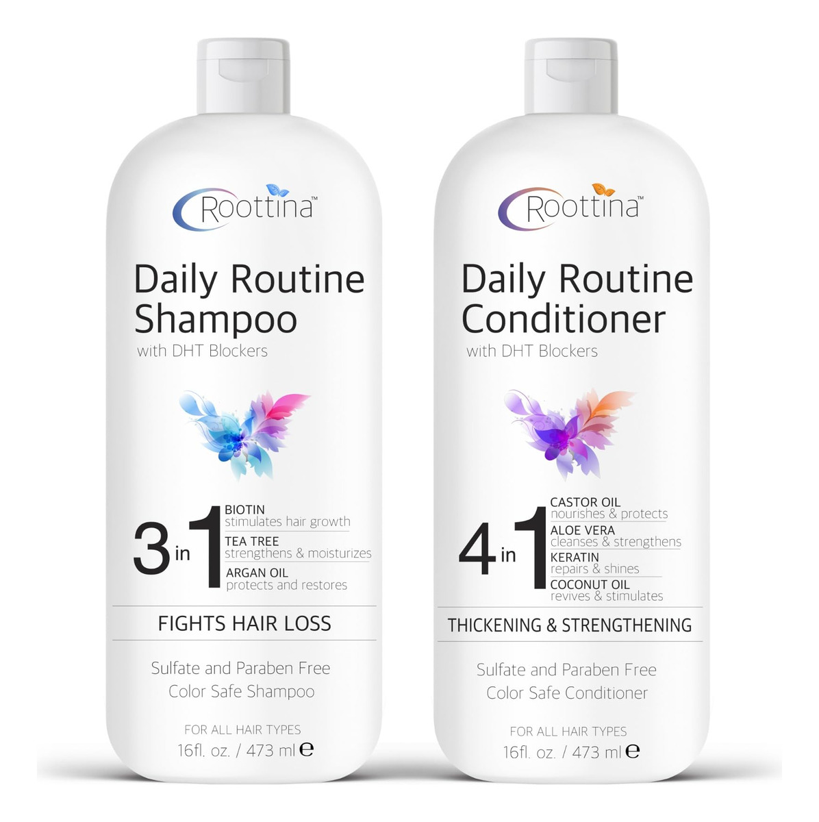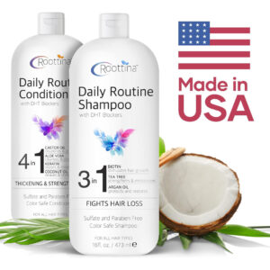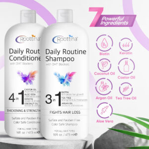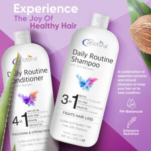 Revitalize seu cabelo com o conjunto de shampoo e condicionador Roottina Daily Routine, nosso “shampoo e condicionador sem sulfato e parabenos” desenvolvido para combater a queda e queda de cabelo de forma eficaz. Este conjunto inclui uma mistura de poderosos bloqueadores de DHT, biotina, melaleuca e óleo de argan no shampoo, complementados por óleo de rícino, aloe vera, queratina e óleo de coco no condicionador. É a escolha perfeita para quem procura “shampoo e condicionador para cabelos mais espessos e cheios”, pois ajuda a fortalecer a haste capilar, melhorar a circulação do couro cabeludo e promover uma aparência mais completa. Formulado especificamente como um “shampoo e condicionador para cabelos finos e fracos”, ele limpa suavemente sem remover a umidade essencial, retém a hidratação intensa e repara os cabelos danificados. Seguro para todos os tipos de cabelo, incluindo cabelos tingidos e tratados com queratina, essa dupla garante que sua rotina de cuidados com o cabelo deixe seu cabelo mais saudável, suave e mais gerenciável. – SUPORTE AVANÇADO PARA QUEDA DE CABELO – O conjunto de shampoo e condicionador Roottina Daily Routine incorpora bloqueadores de DHT de última geração para combater eficazmente a queda de cabelo. Enriquecido com biotina, melaleuca e óleo de argan no xampu e óleo de rícino, aloe vera, queratina e óleo de coco no condicionador. – FÓRMULA PARA ESPESSAR O CABELO — Esta mistura potente é nosso melhor shampoo e condicionador para cabelos finos. Ajuda a fortalecer a haste capilar, promovendo a circulação natural do couro cabeludo, que ajuda a engrossar cabelos finos e reduzir a queda de cabelo, criando uma aparência mais completa. – IDEAL PARA CABELOS FINOS E FRACOS – A combinação única de óleos e extratos naturais em nosso melhor shampoo e condicionador para crescimento capilar foi projetada especificamente para estimular o crescimento de cabelos finos e secos, sendo suave o suficiente para limpar sem remover a umidade essencial. – FÓRMULA RICA EM HIDRATAÇÃO PARA CABELOS LISOS — Experimente hidratação intensa e reparação capilar com nosso shampoo e condicionador para queda de cabelo mistura rica. Ele retém a umidade com eficácia, reduz o crespo e deixa o cabelo sedoso, melhorando a maleabilidade e o brilho dos fios secos e quebradiços. – SUAVE E SEGURO PARA TODOS OS TIPOS DE CABELO – Nosso conjunto de xampu e condicionador sem sulfato foi criado para ser seguro para todos os tipos de cabelo, incluindo cabelos tingidos e tratados com queratina.